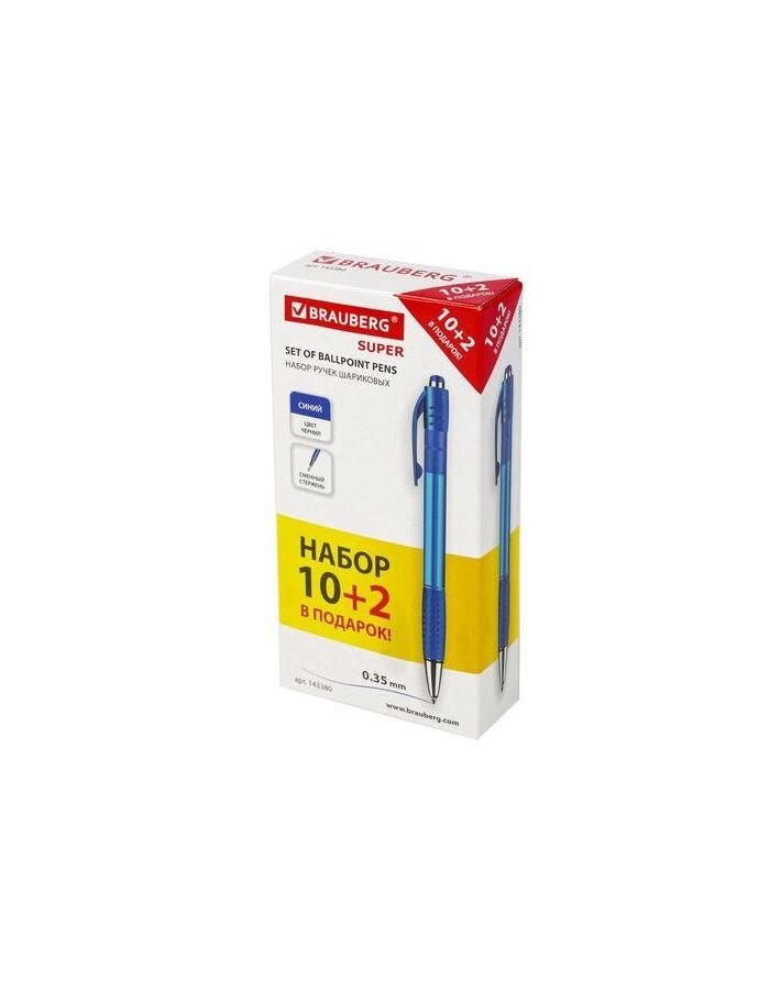 Ручки шариковые синие автоматические Brauberg Super "10+2 в подарок", набор 12 штук в упаковке, линия 0,35 мм