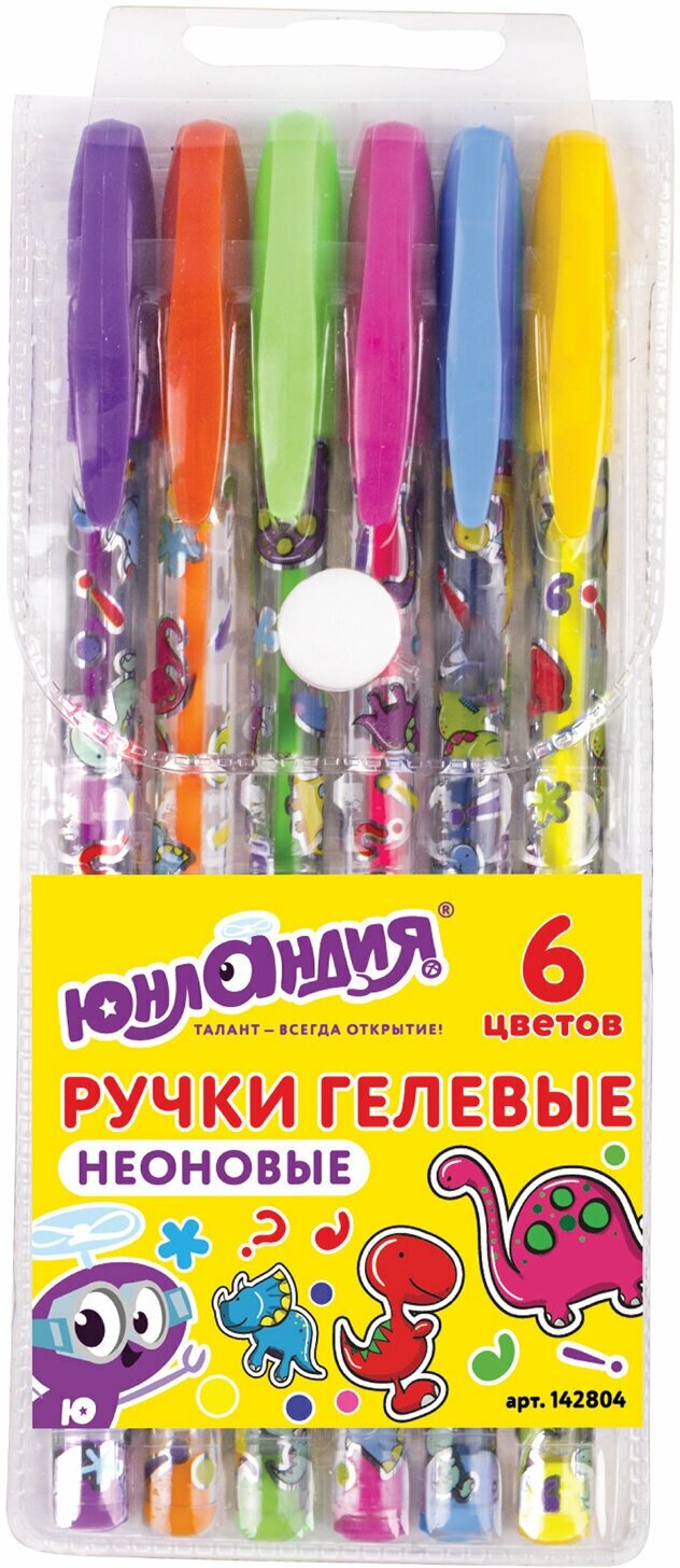 Ручки гелевые юнландия, набор 6 цветов, неон, корпус с печатью, 0,7 мм, линия 0,5 мм, 142804
