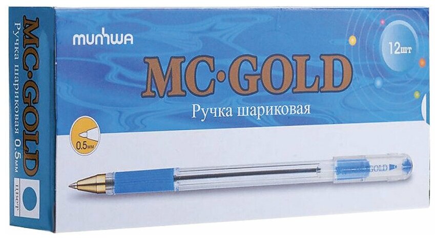 Ручка шариковая MunHwa "MC Gold" синяя, 0,5мм, грип, штрих-код, 12 шт. в упаковке