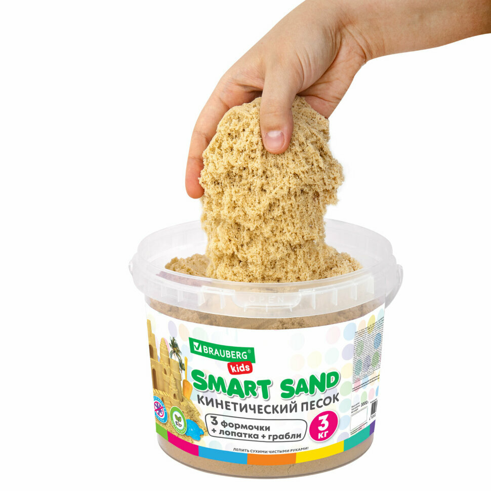 Кинетический песок для детей и малышей набор 3 кг с 3 формочками, лопатка грабли ведро для лепки, песочный, Brauberg Kids, 665480