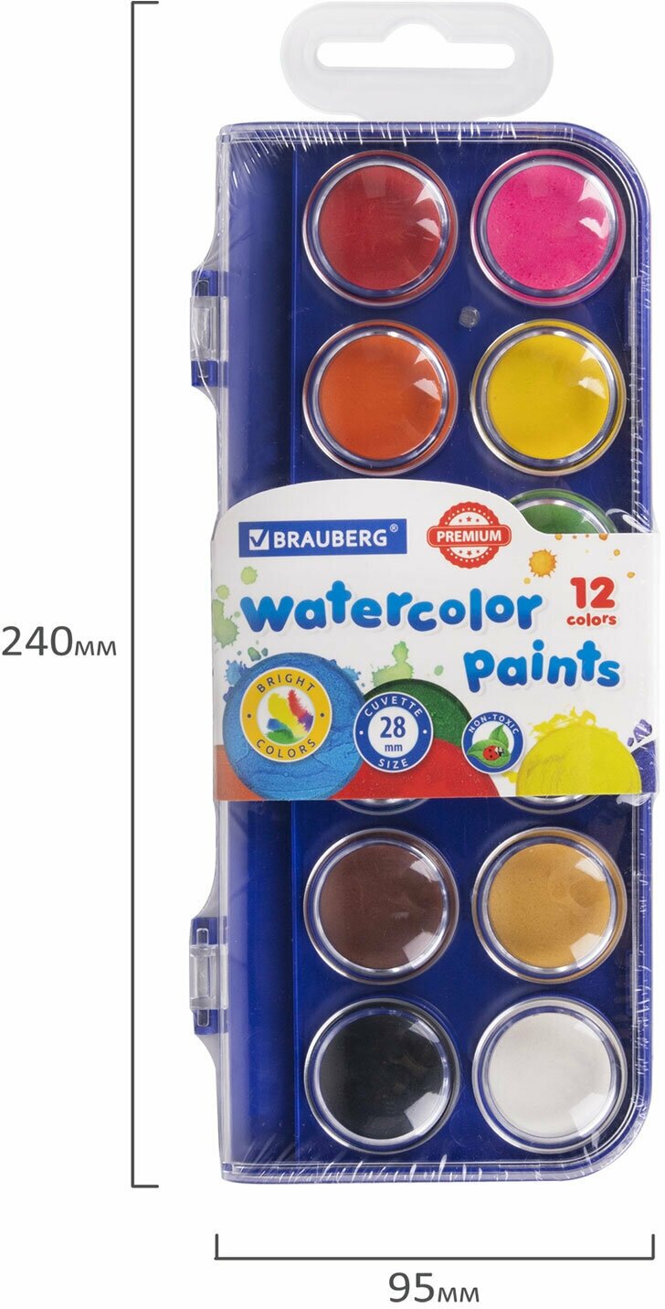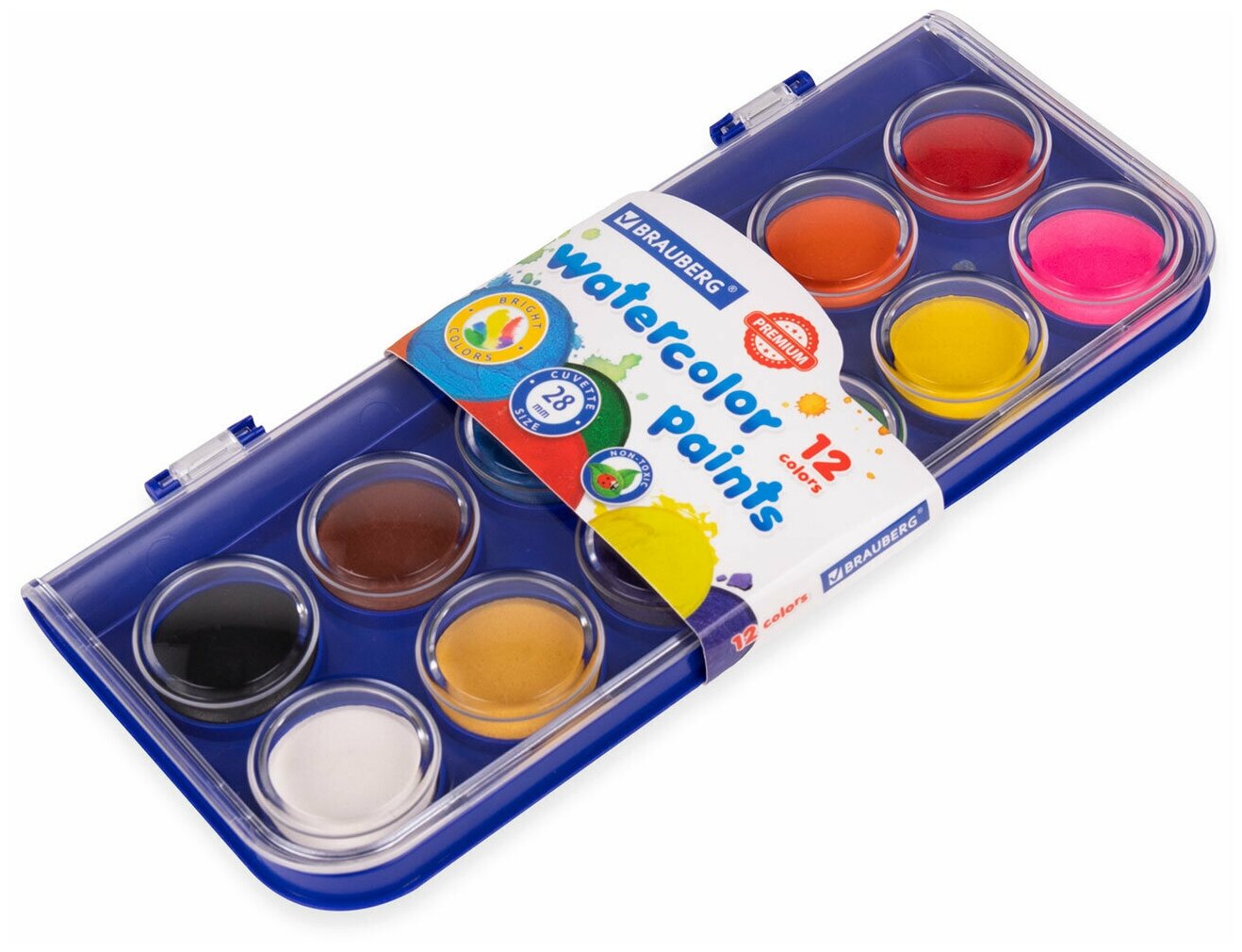 Краски акварельные 12 цветов Brauberg Premium, круглые кюветы 28 мм, пенал (191743), 12 уп.