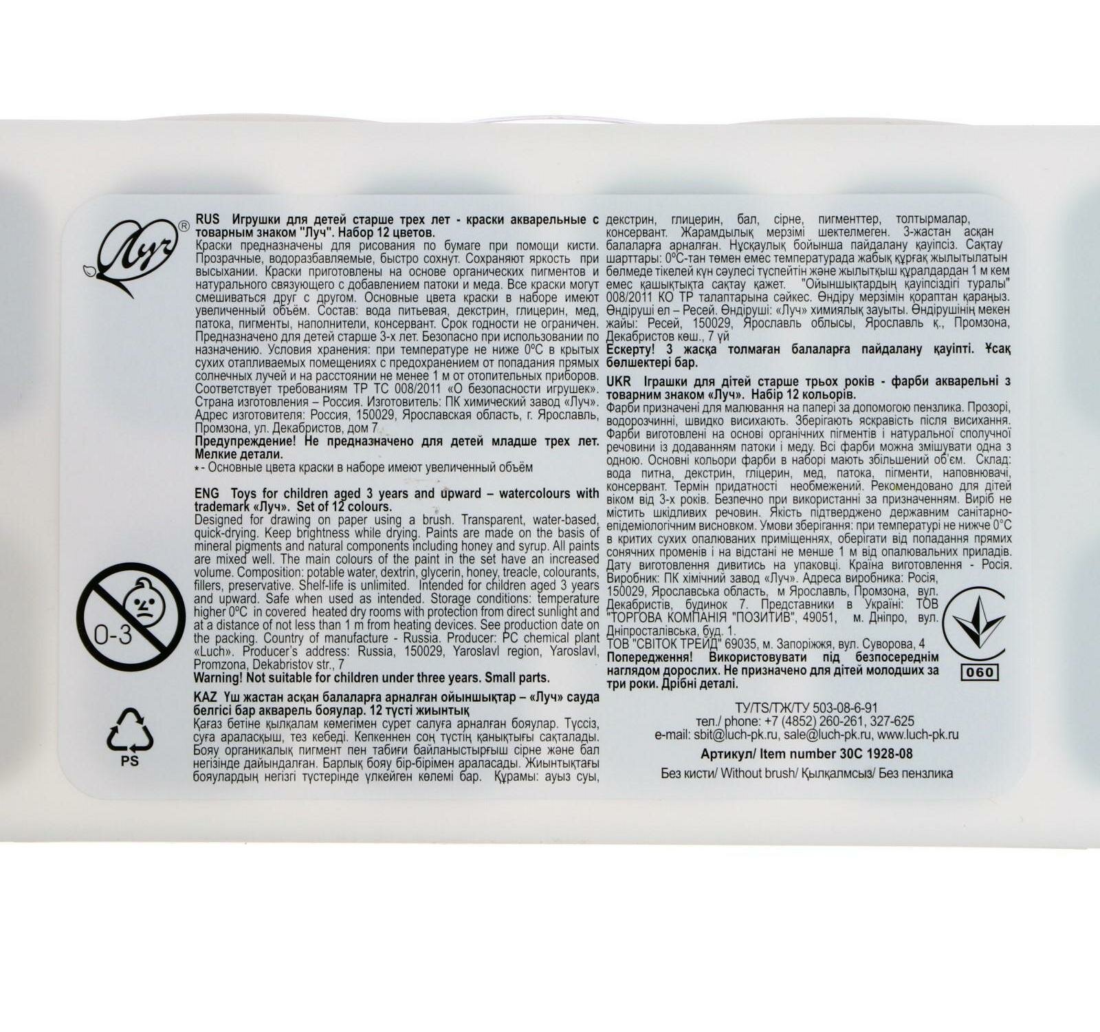 | Дополнительная информация | круглые кюветы; хранить в сухом отапливаемом помещении при температуре не ниже 0°С на расстоянии не менее 1 м от приборов отопления; для детей старше 3 лет; габариты упаковки 23.2 × 13.1 × 1.5 см; легко смывается с рук и одежды |