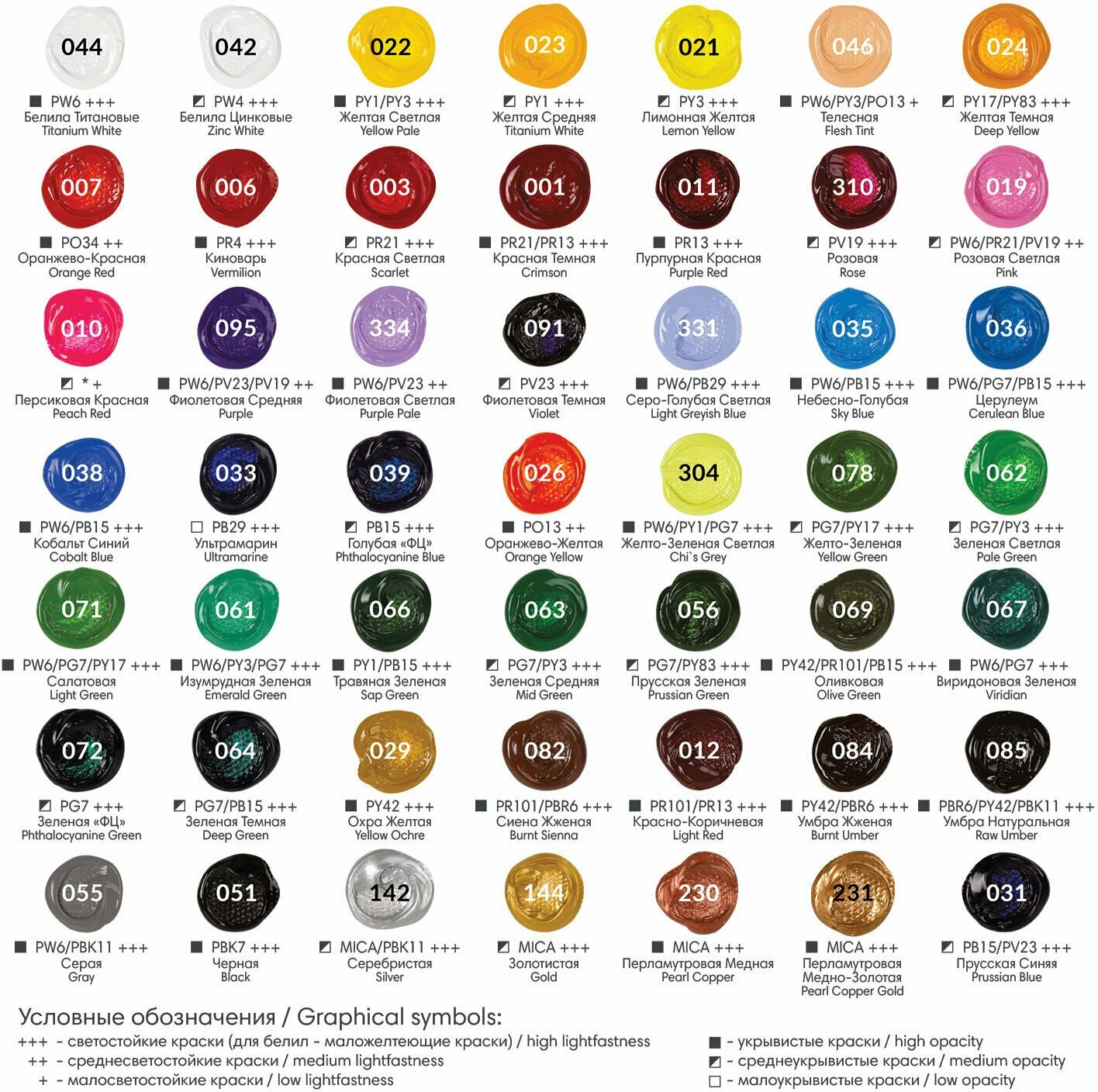 | Комплектация | в наборе 11 цветов: - белила титановые (044) - 2 шт.; - лимонная желтая (021); - оранжево-желтая (026); - красная темная (001); - церулеум (036); - голубая ФЦ (039); - зеленая светлая (062); - охра желтая (029); - сиена жженая (082); - умбра жженая (084); - черная (051) |
