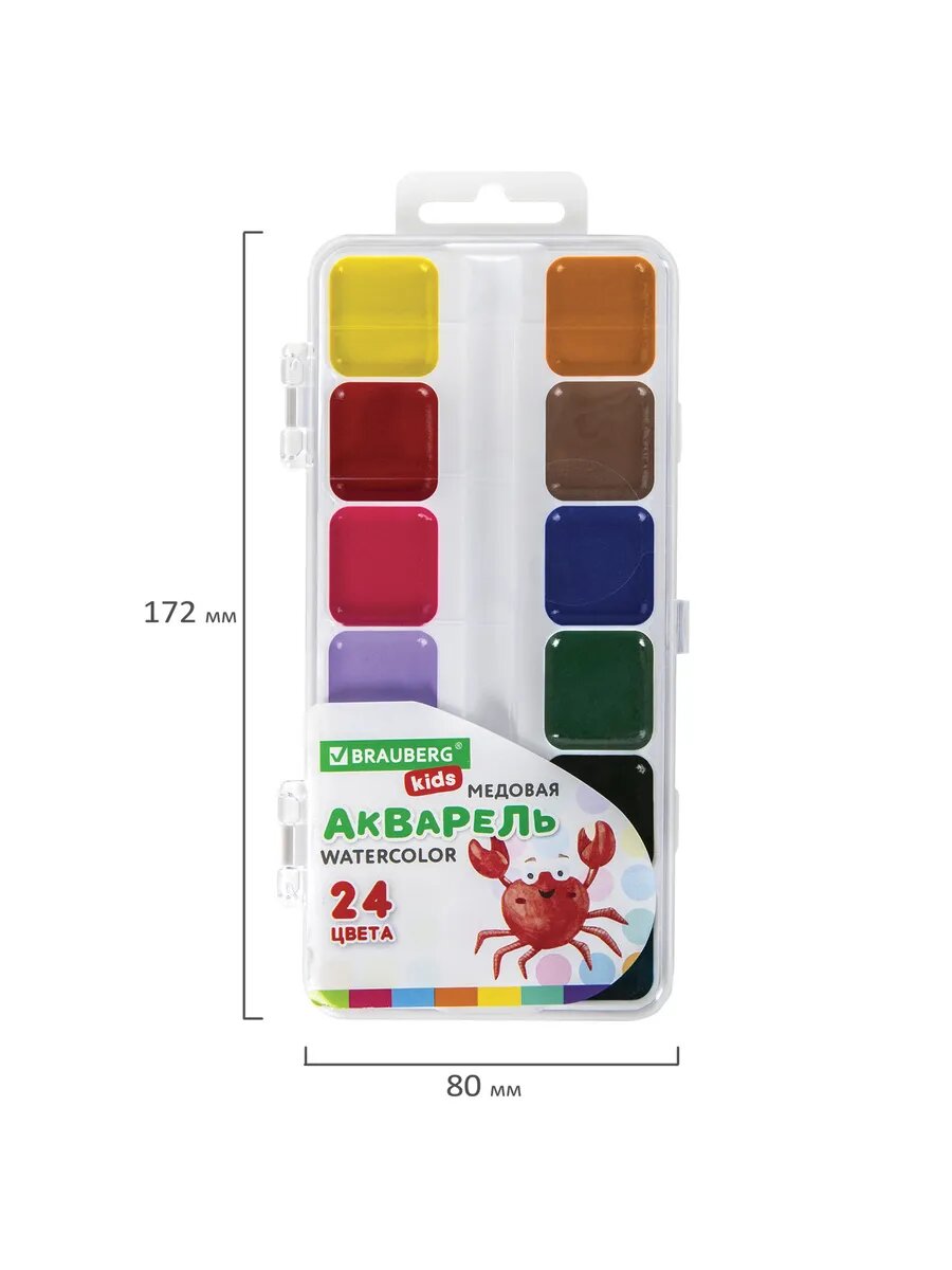 Краски акварельные BRAUBERG KIDS, медовые, 24 цвета, квадратные кюветы, пластиковый пенал, 192284