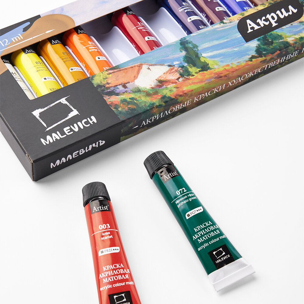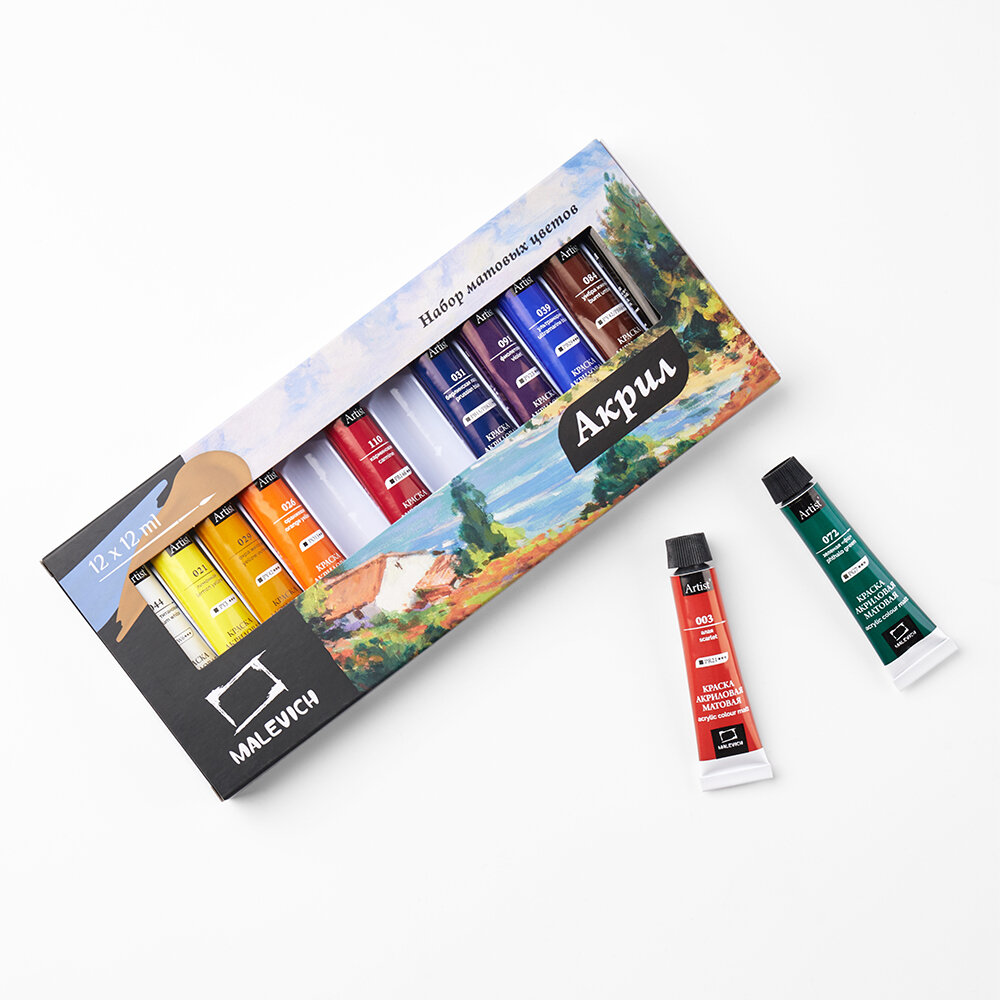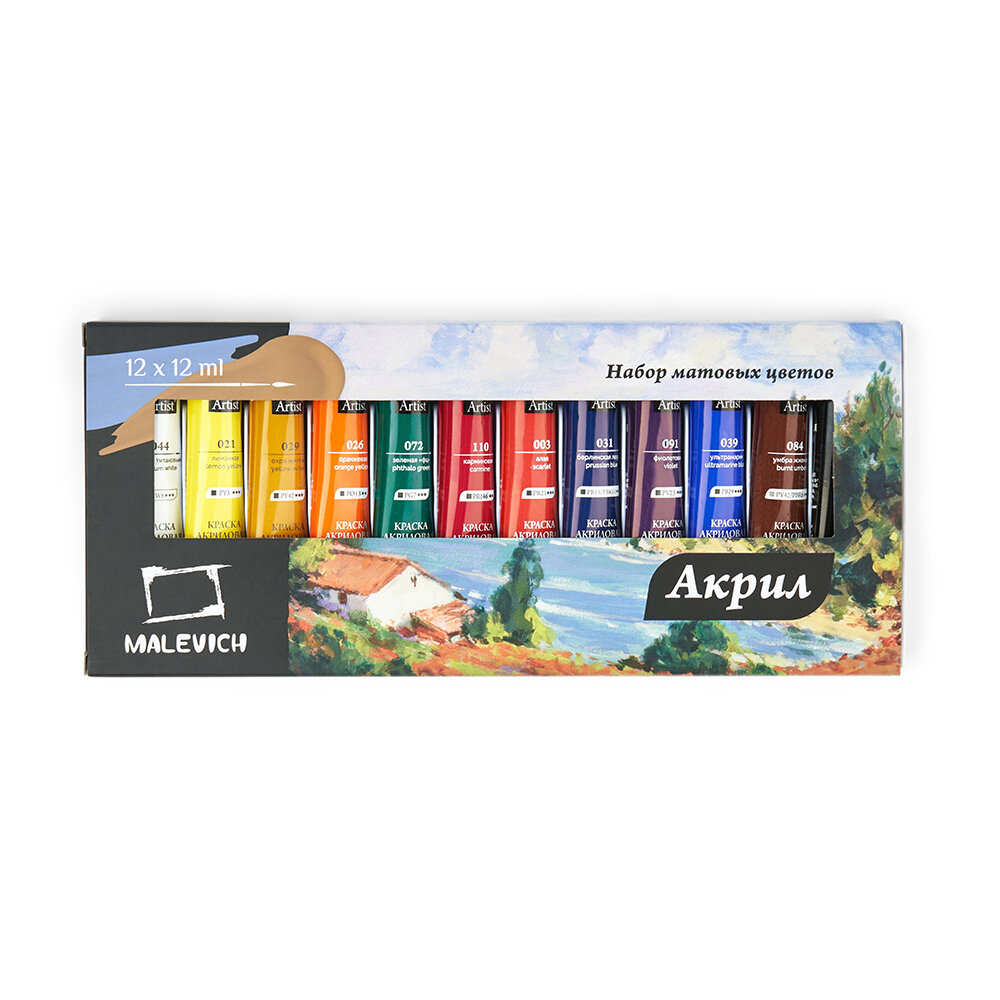 Набор матовых акриловых красок Малевич, 12 цв. по 12 мл