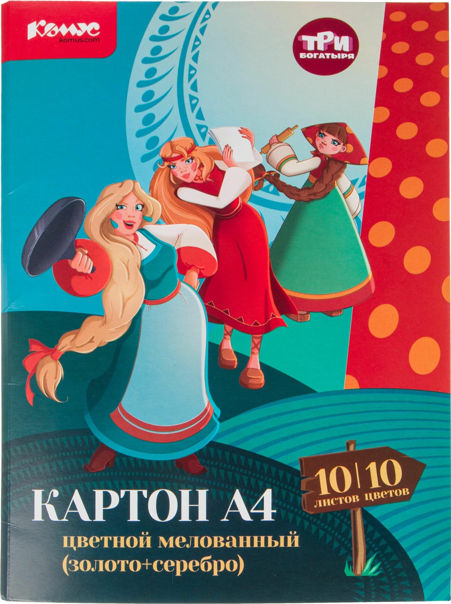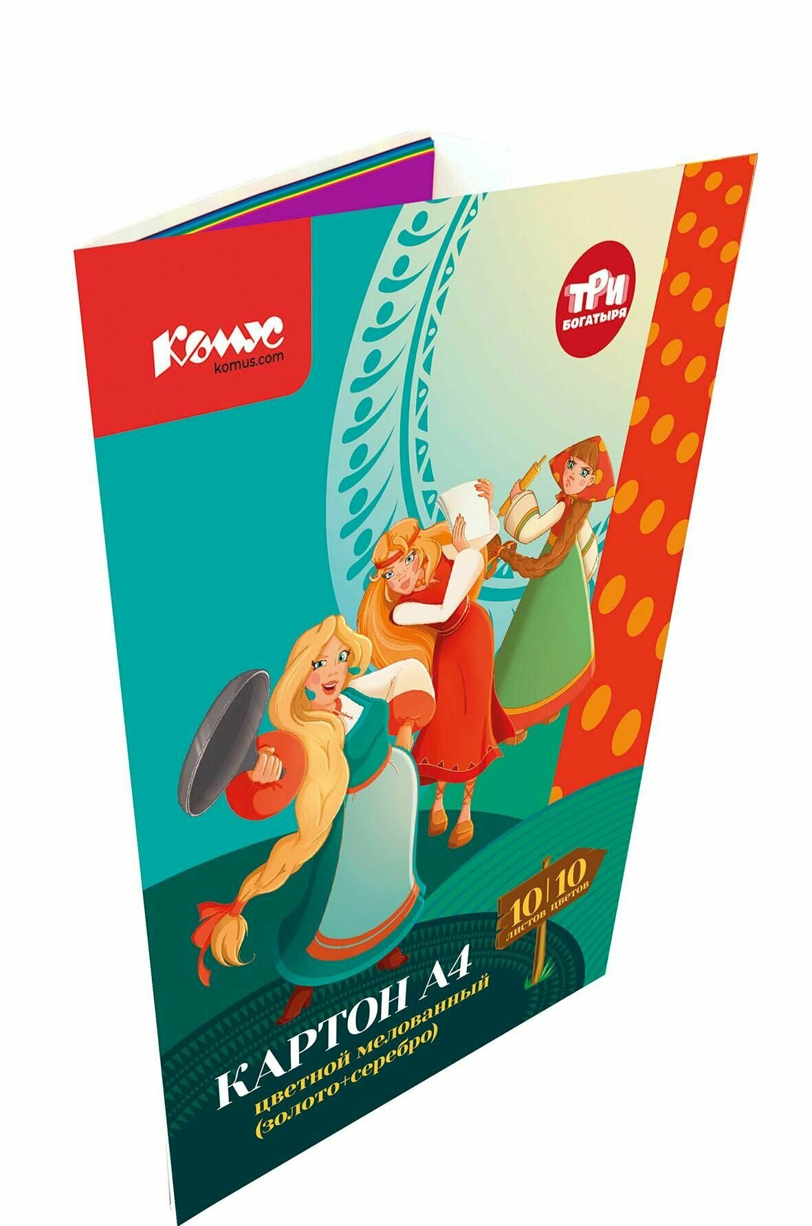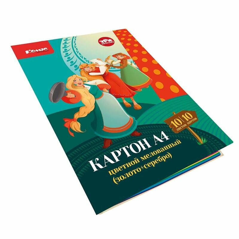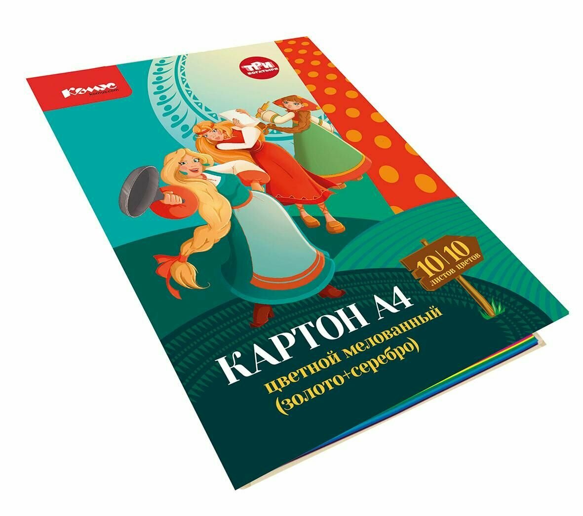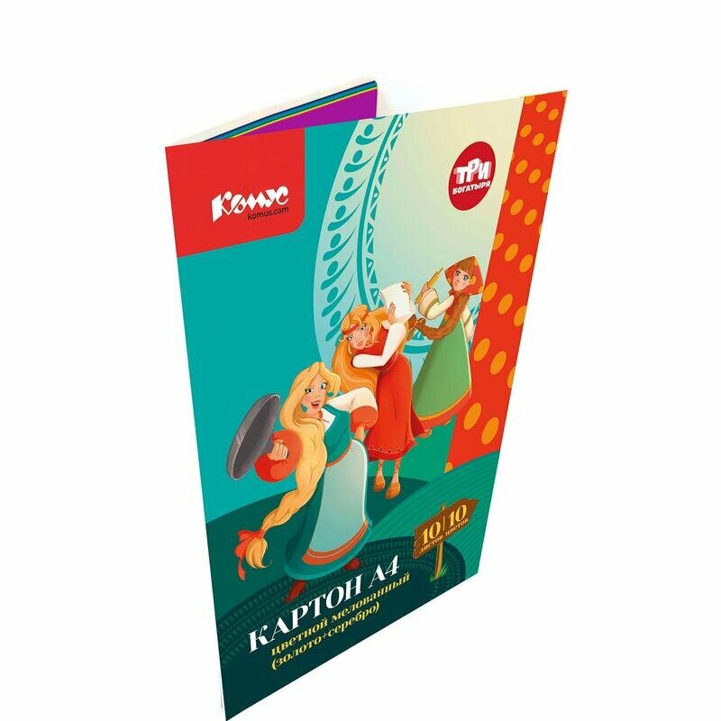 Купить Цветной картон Комус Три Богатыря, А4, 10 листов, 8 цветов, золотой, серебряный, мелованный