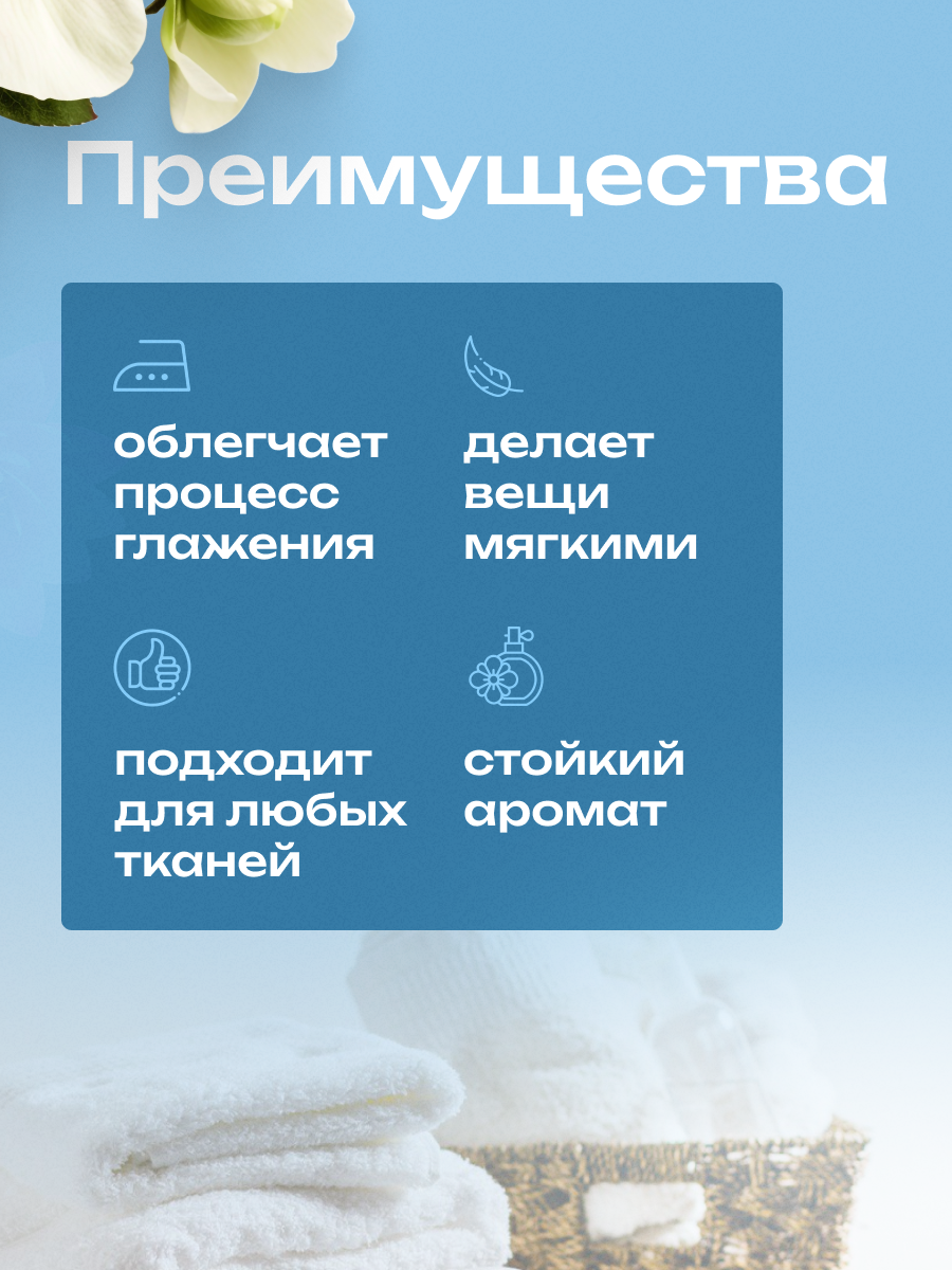 | Эффект | антибактериальный / антистатический / легкая глажка / смягчение ткани / устранение неприятных запахов |