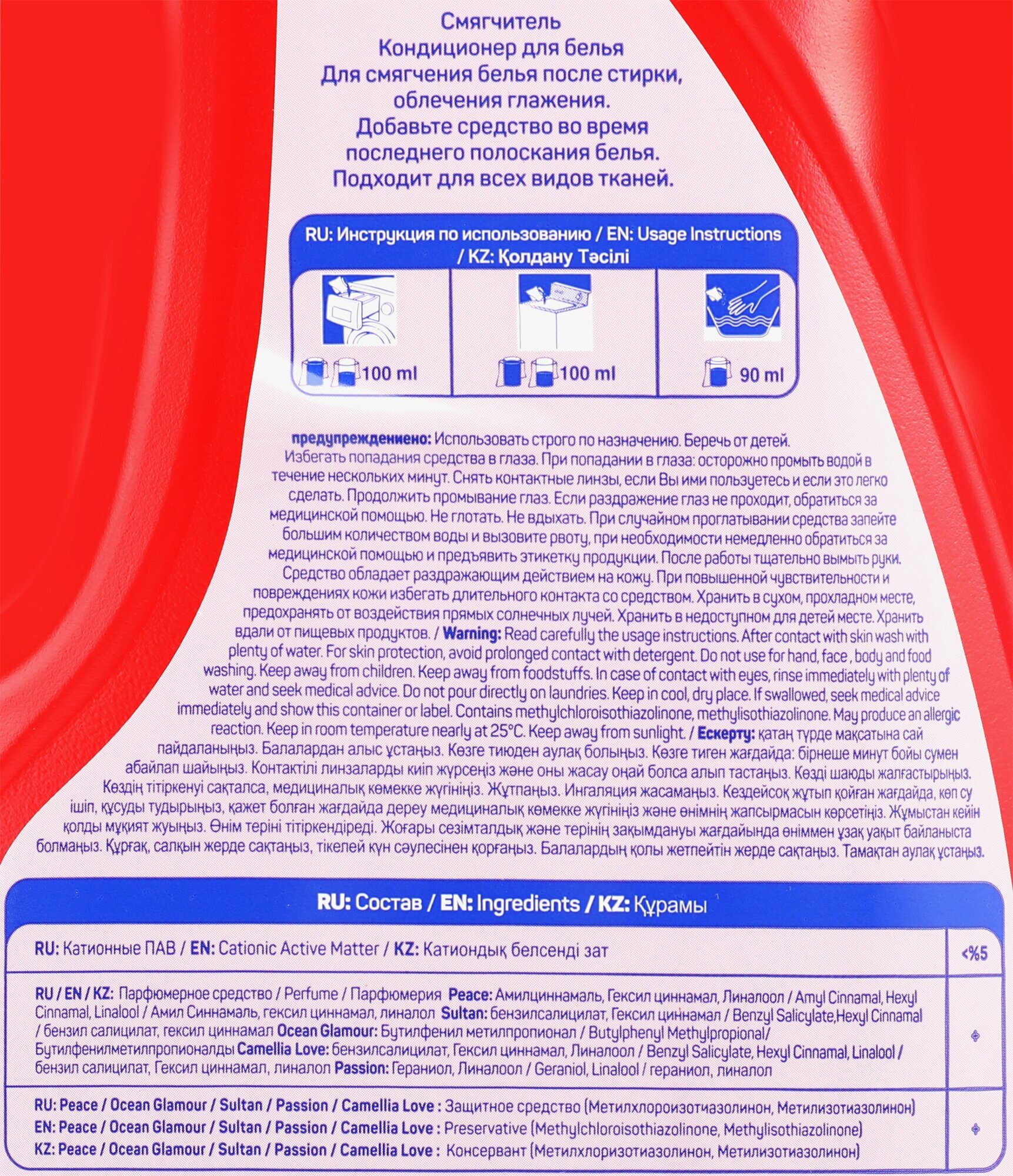 | Способ применения | перед применением энергично встряхнуть. После стирки обычным порошком добавьте кондиционер в воду для последнего полоскания белья. Для лучшего результата не полощите белье после использования кондиционера. Для ручной стирки и стиральных машин активаторного типа: добавьте 2/3 колпачка в 10–15л воды, опустите белье в раствор, отожмите и высушите. Для автоматических стиральных машин добавьте 1 колпачок во время последнего полоскания белья |
