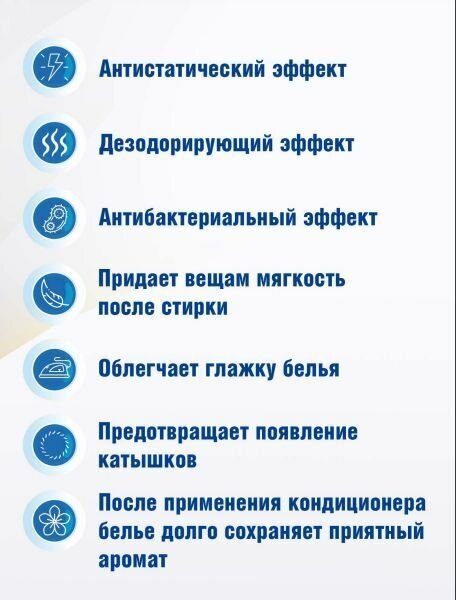| Эффект | антибактериальный / антистатический / легкая глажка / смягчение ткани / устранение неприятных запахов |