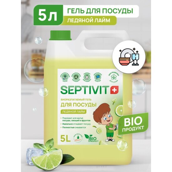 Средство для мытья посуды, овощей и фруктов SEPTIVIT / Гель для мытья посуды Септивит, Ледяной лайм 5л
