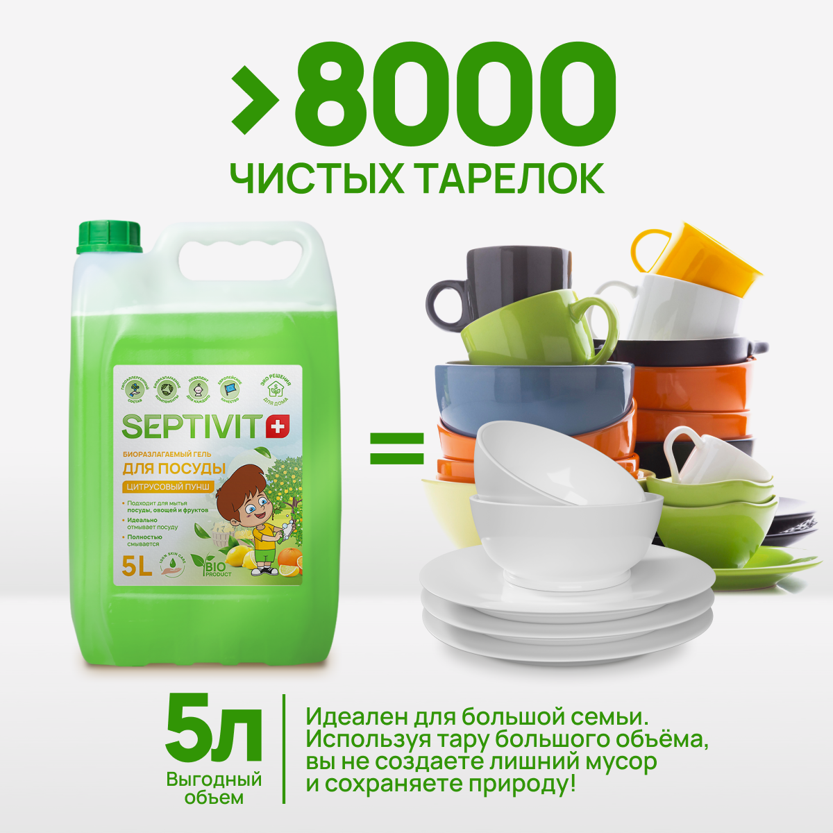 Средство для мытья посуды, овощей и фруктов SEPTIVIT / Гель для мытья посуды Септивит, Ледяной лайм 5л