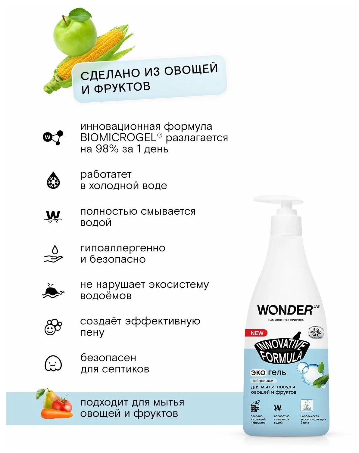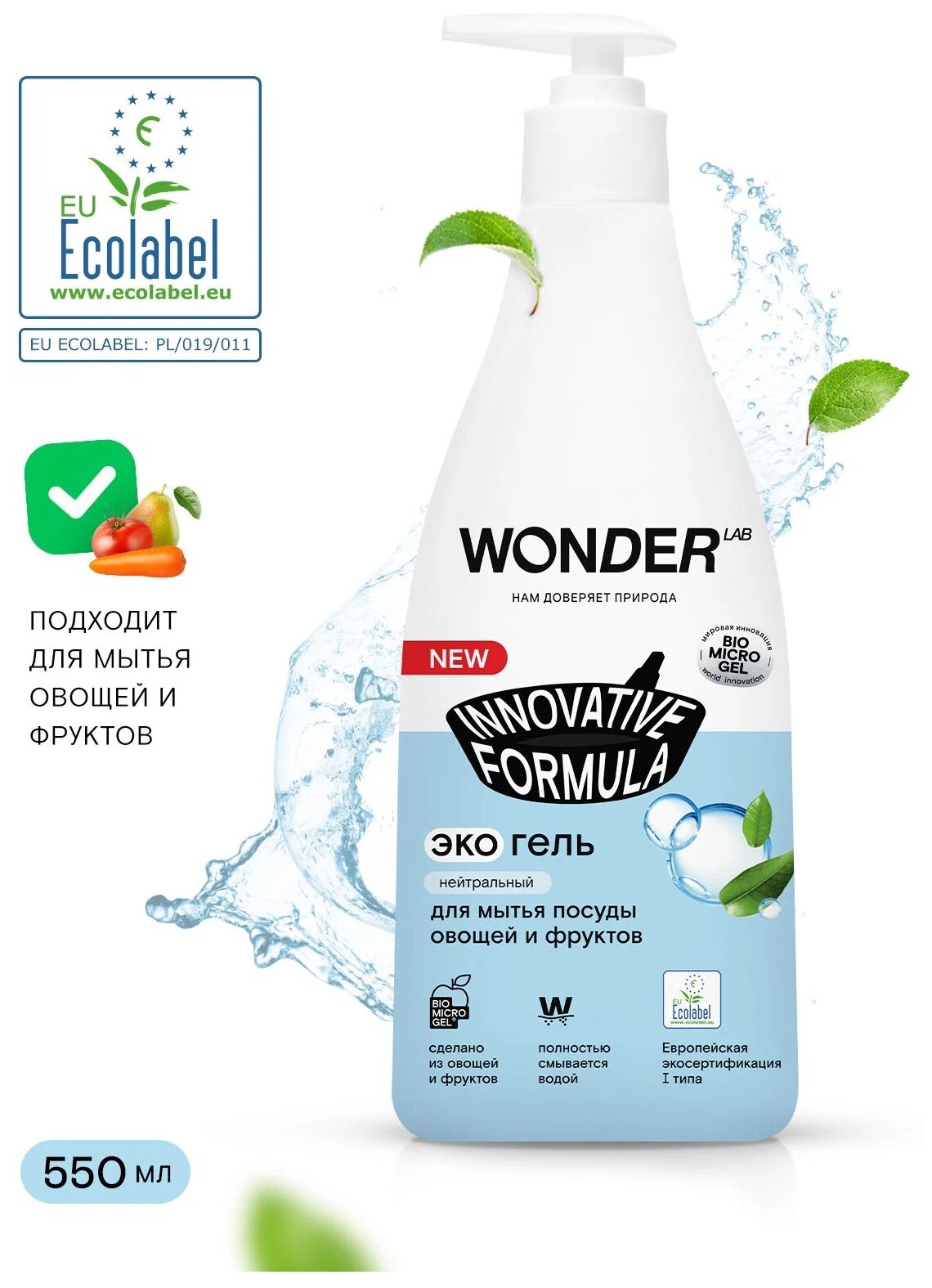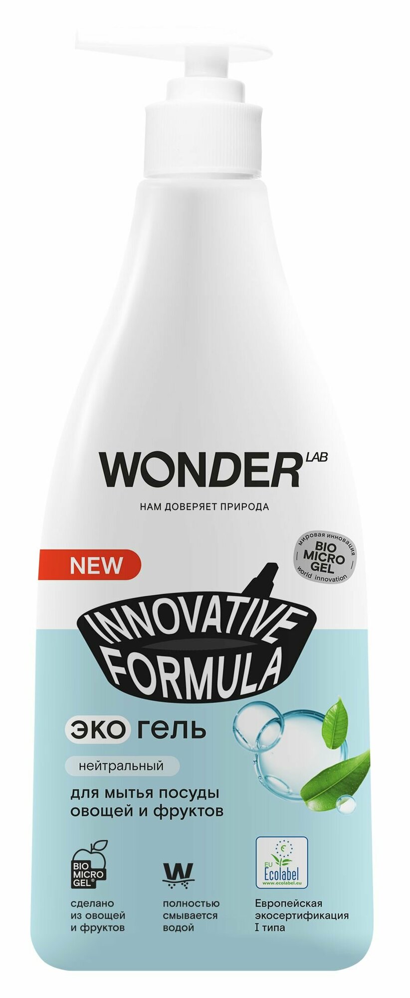 Купить WONDER LAB экогель для мытья посуды овощей и фруктов Innovative Formula нейтральный с дозатором, 0.55 л