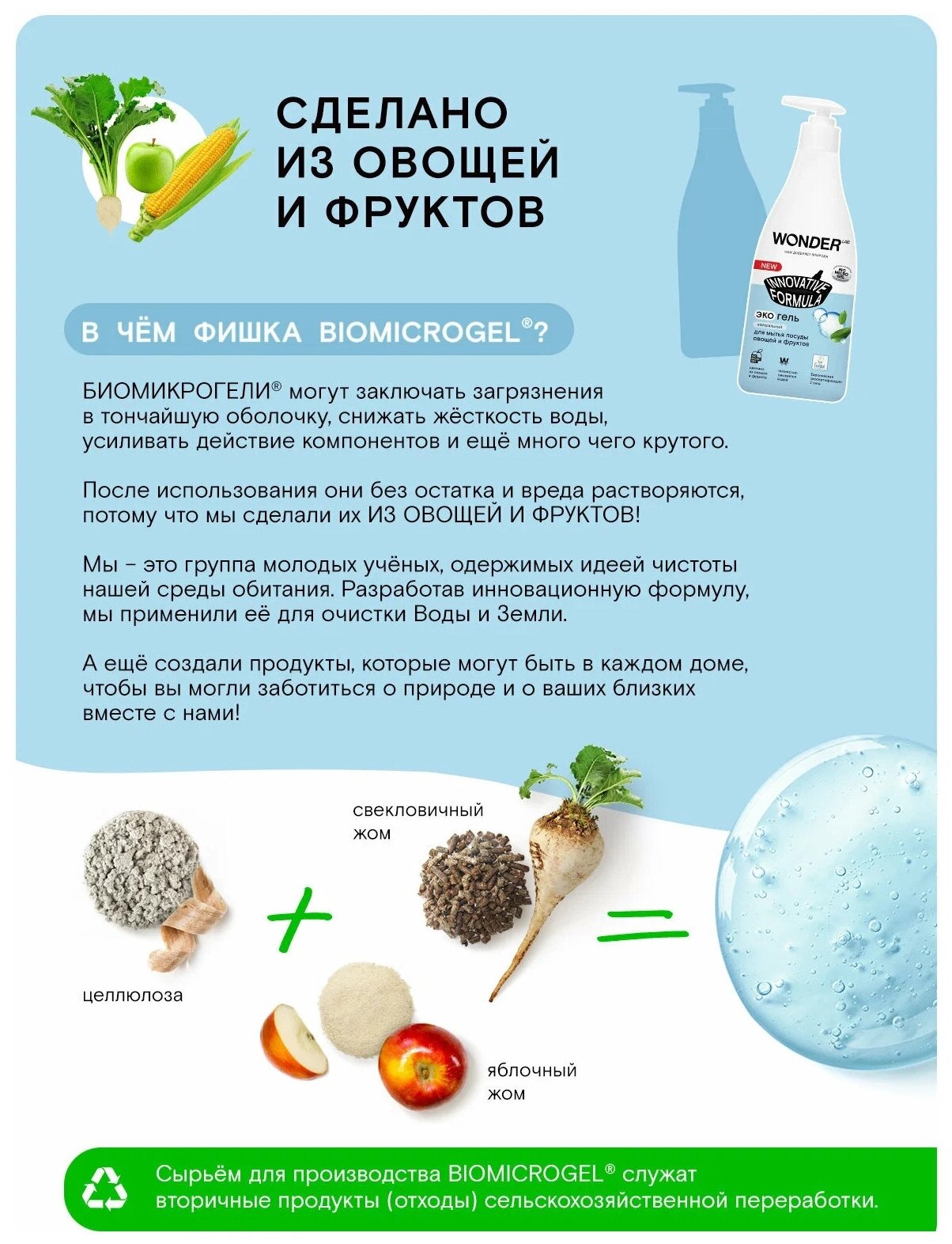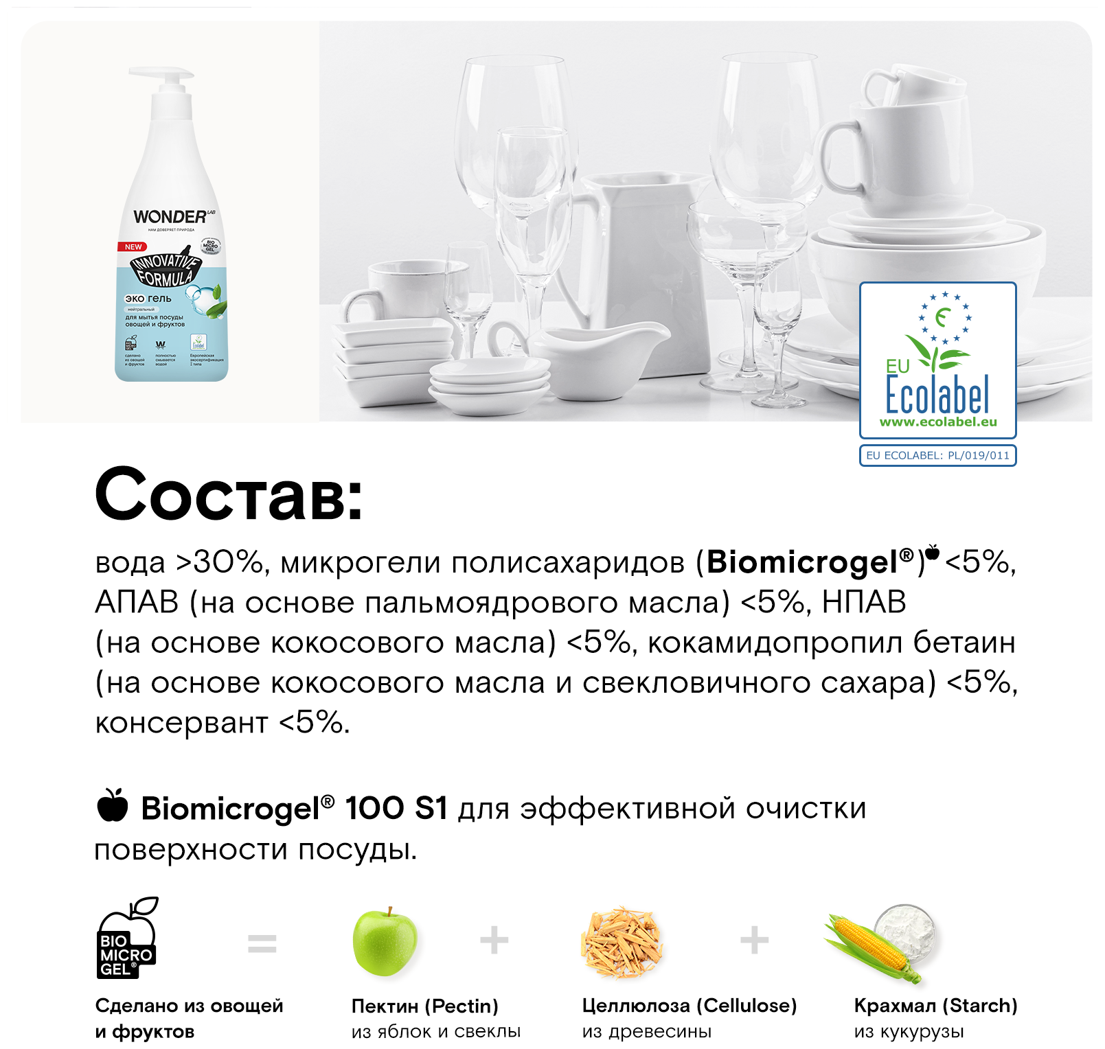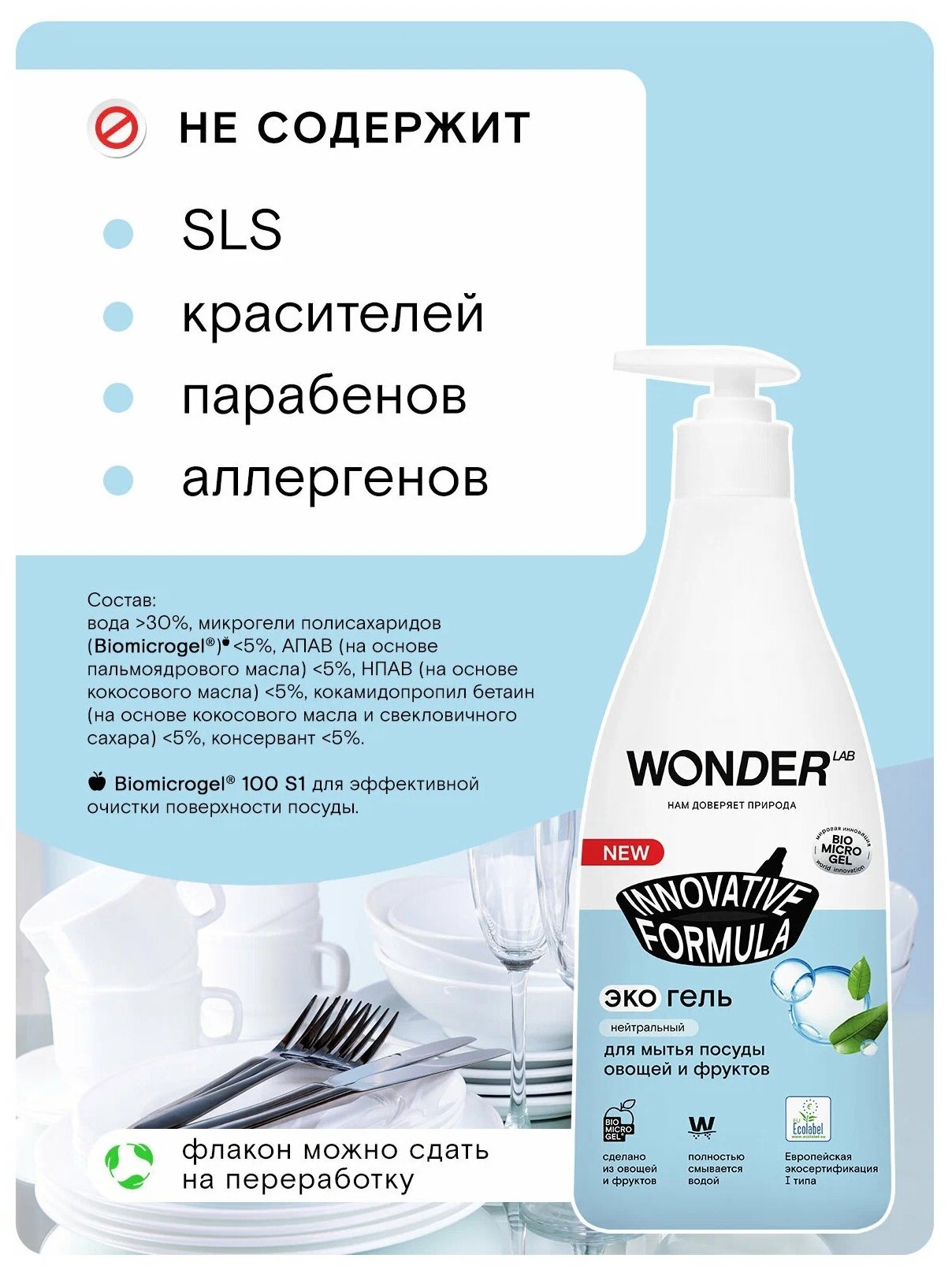 Купить WONDER LAB экогель для мытья посуды овощей и фруктов Innovative Formula нейтральный с дозатором, 0.55 л