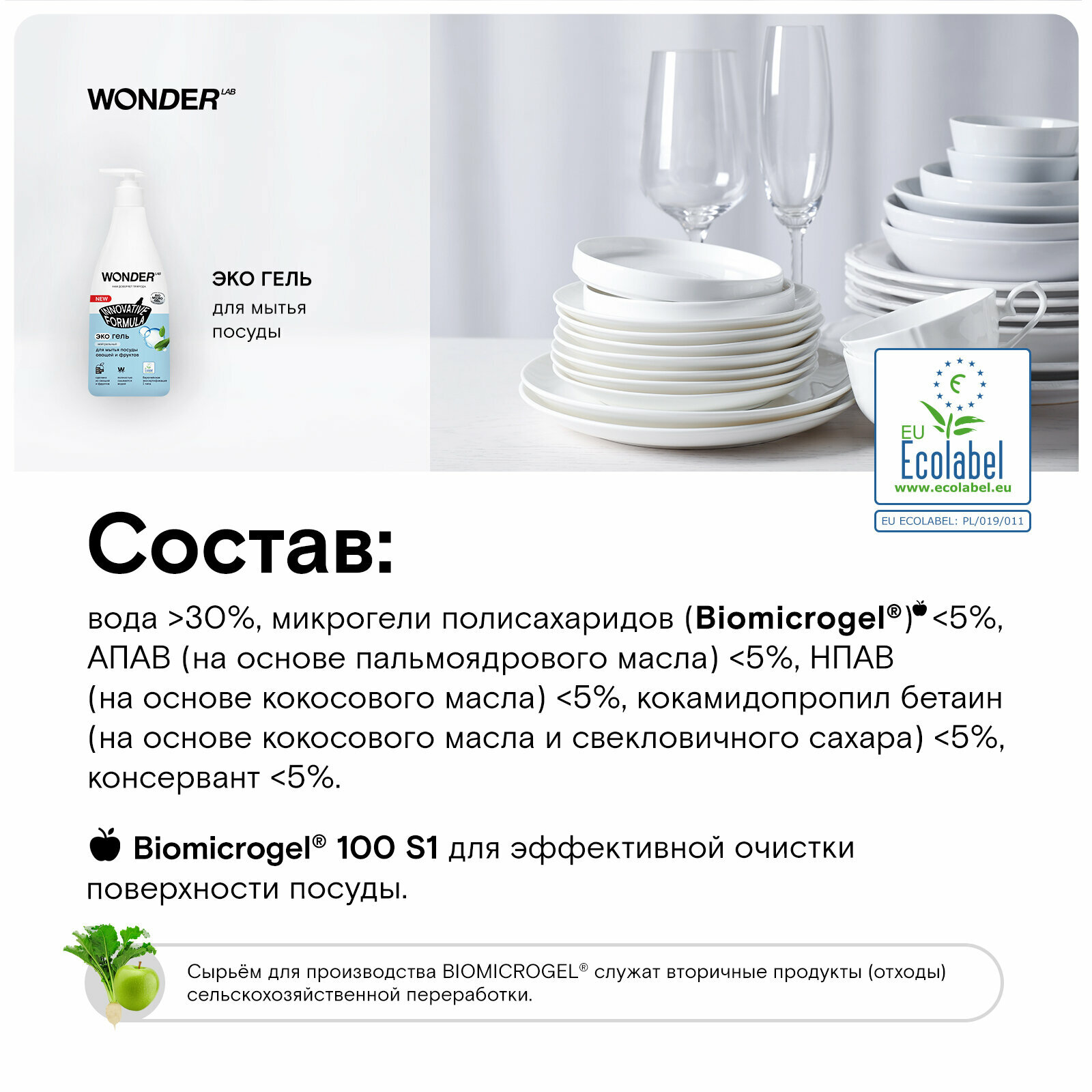 WONDER LAB Экогель для мытья посуды, овощей и фруктов Нейтральный, 550 мл