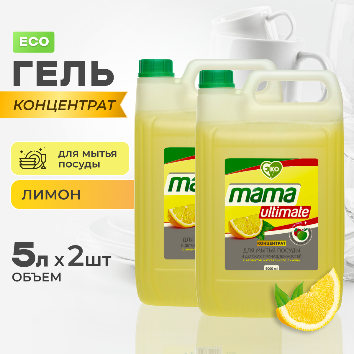 Набор Средство гель для мытья посуды концентрат Mama Ultimate лимон 5 л и Гель концентрат для стирки Mama Ultimate универсальный, 2.5 л