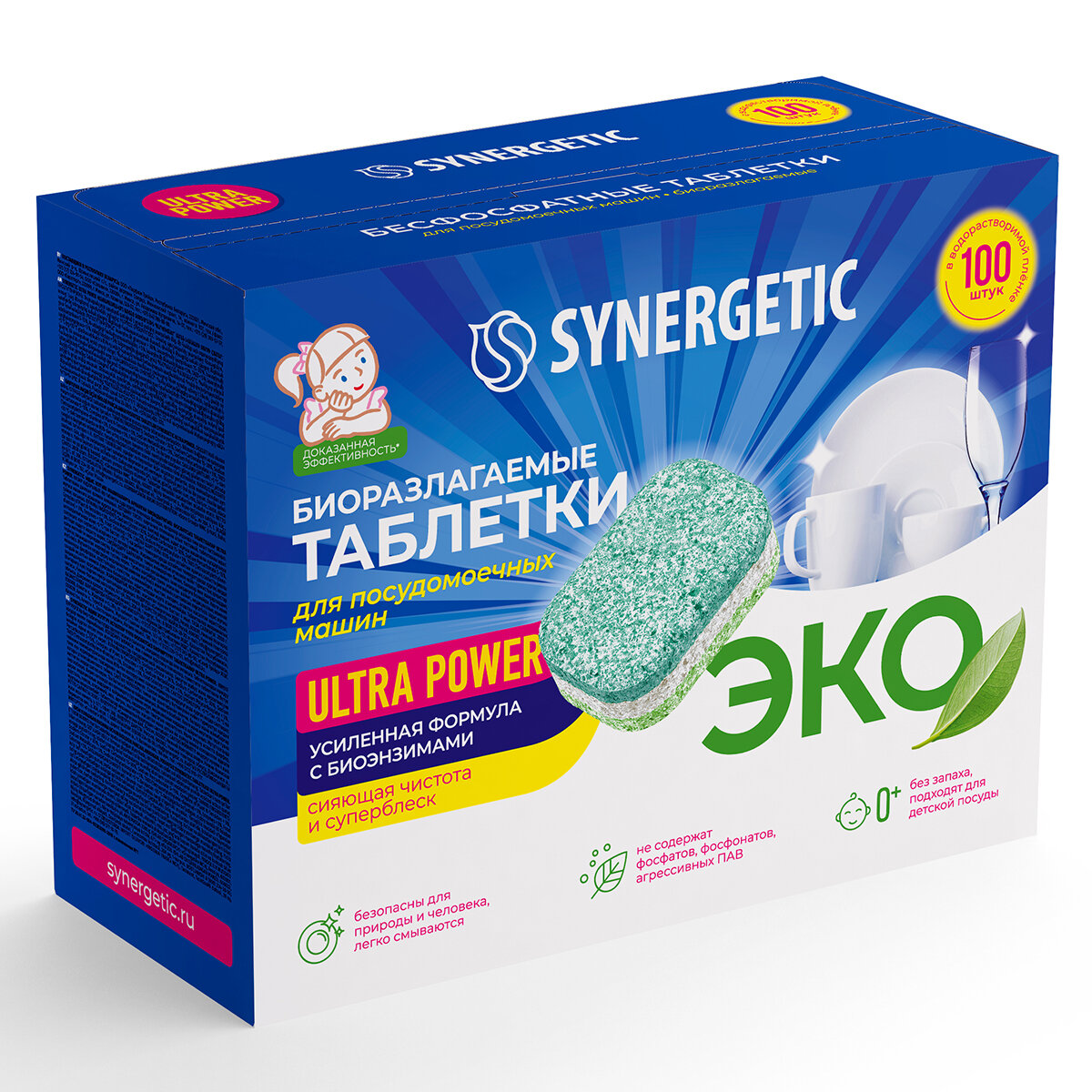 Таблетки для посудомоечных машин Synergetic Ultra power, бесфосфатные,биоразлагаемые, 100 шт