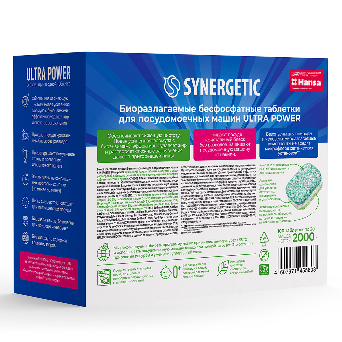 Биоразлагаемые бесфосфатные таблетки для посудомоечных машин SYNERGETIC ULTRA POWER в водорастворимой пленке, 80 шт.