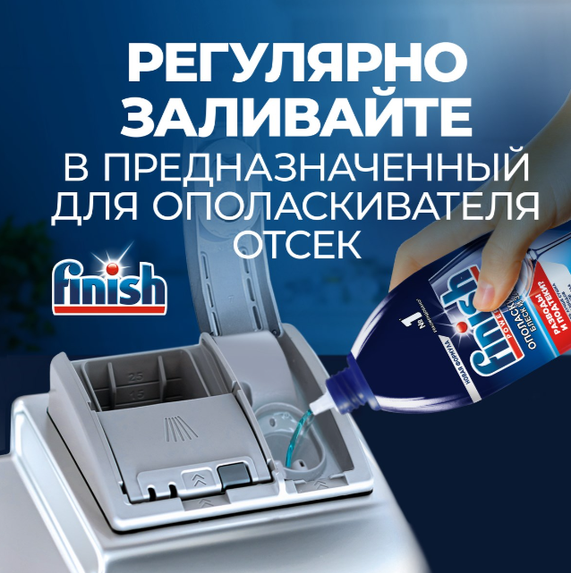 | Способ применения | найдите отсек для ополаскивателя (обычно круглой формы), расположенный рядом с отсеком для моющего средства. Заполните отсек для ополаскивателя и протрите его снаружи насухо, убедитесь, что он заполнен полностью |