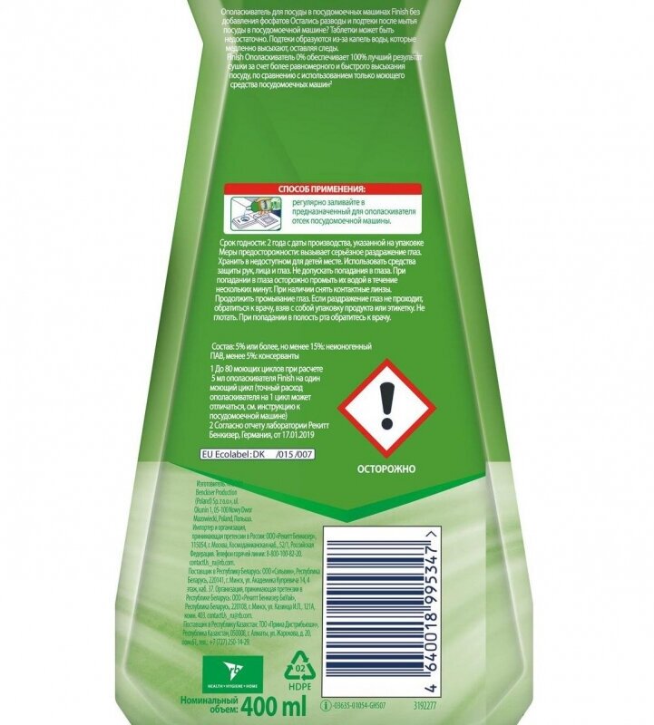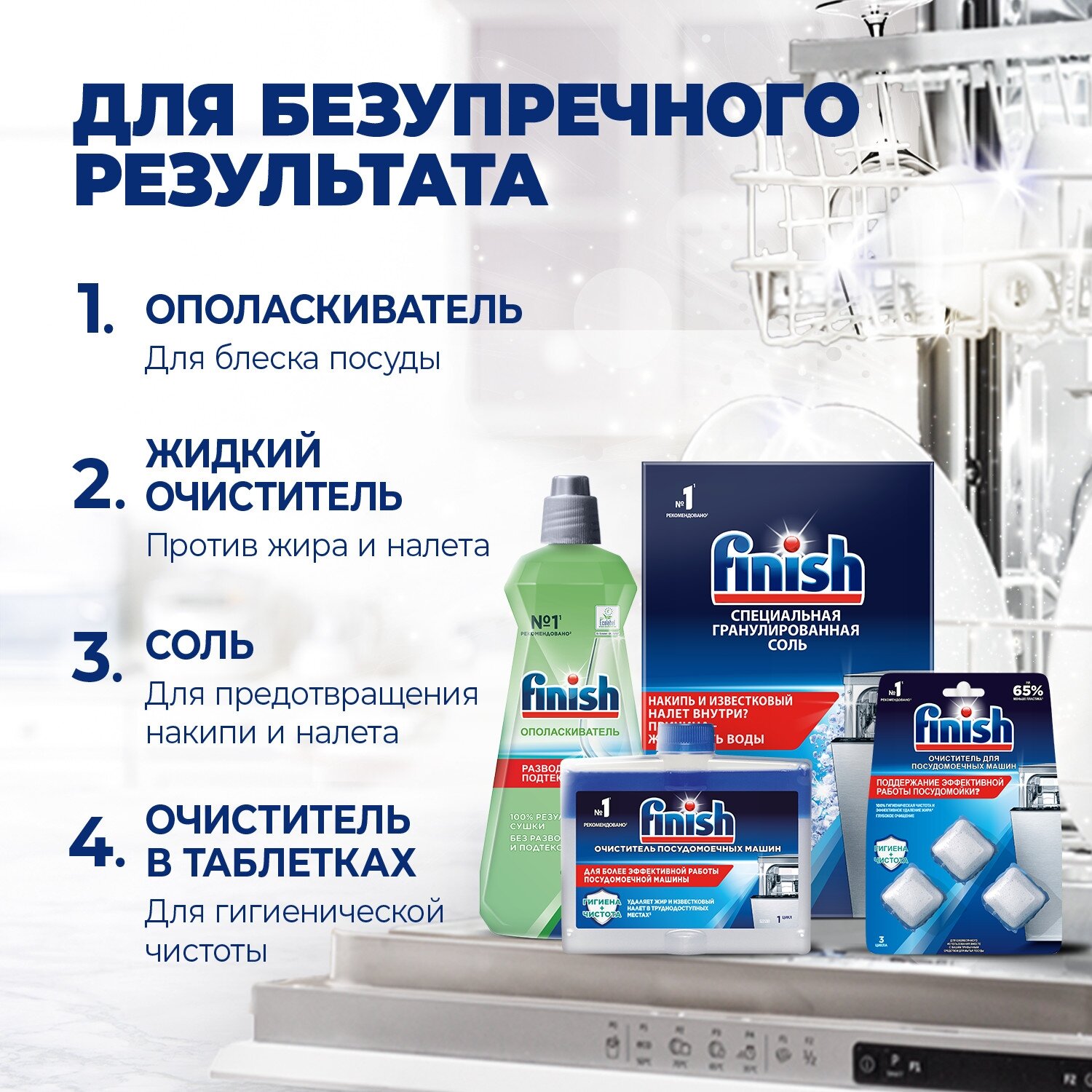 | Способ применения | Регулярно заливайте в предназначенный для ополаскивателя отсек посудомоечной машины. Для наилучшего результата и в целях экономии воды и энергии выбирайте режим мойки с температурой 50-55 °С или «авто». *До 80 моющих циклов при расчете 5 мл ополаскивателя Finish на один моющий цикл (точный расход ополаскивателя на 1 цикл может отличаться, см. инструкцию к посудомоечной машине) |