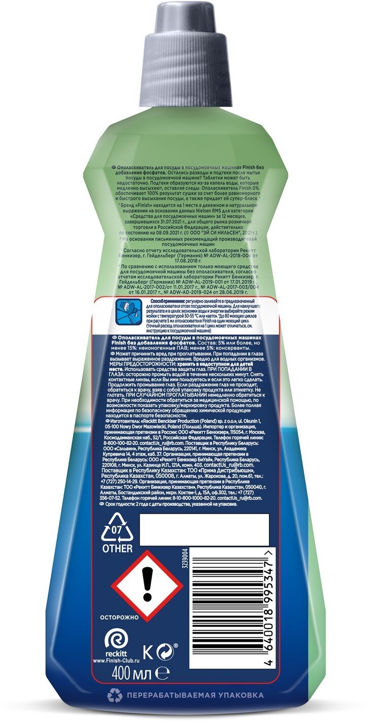 Ополаскиватель Finish Green 0% ЭКО, без фосфатов и консервантов, для блеска, без отдушки, 400мл интересное: