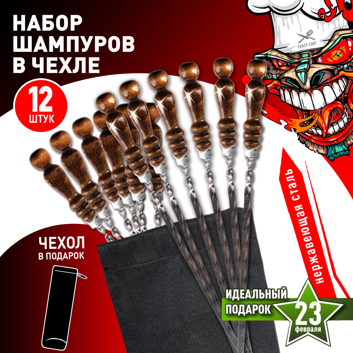 Набор шампуров 62 см 12 штук в чехле / Шампуры из нержавеющей стали с деревянной ручкой из бука