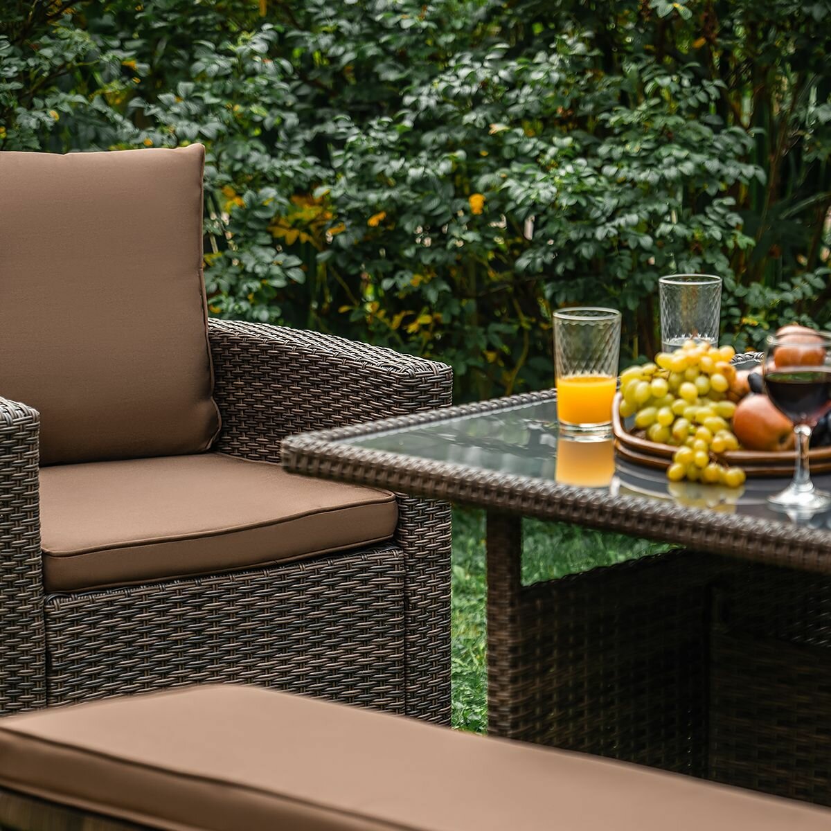 | Комплектация | Трёхместный диван с подушками на сиденье и под спину; Два кресла с подушками на сиденье и под спину; Обеденный стол с закалённым стеклом 5мм; Скамейка с подушкой. Набор садовой мебели |