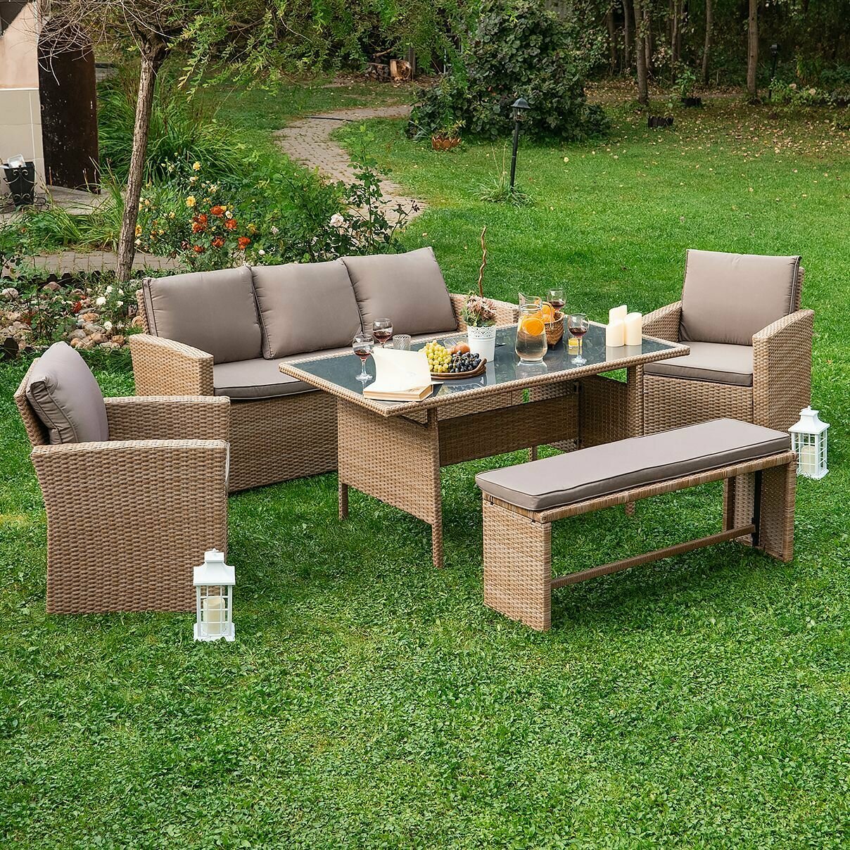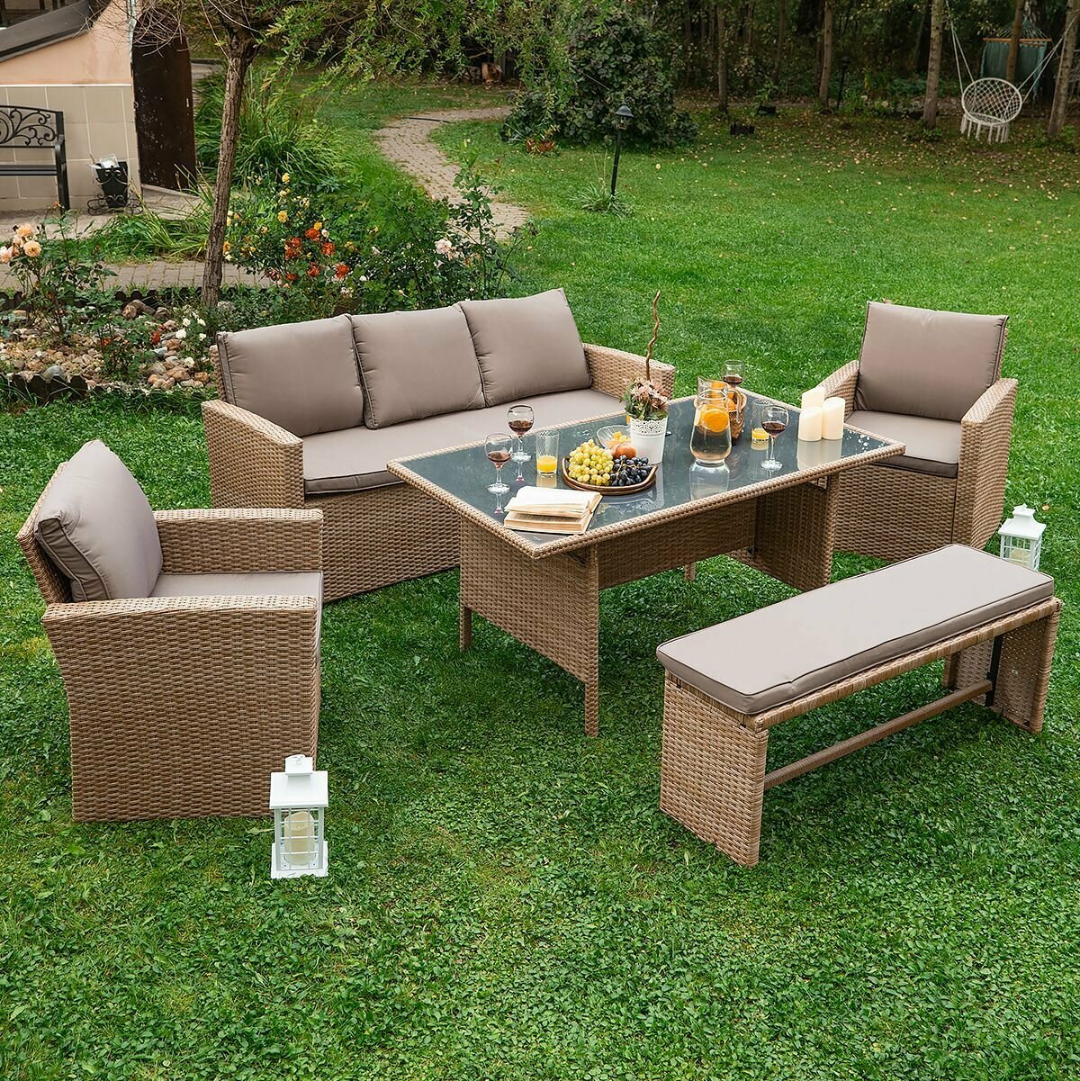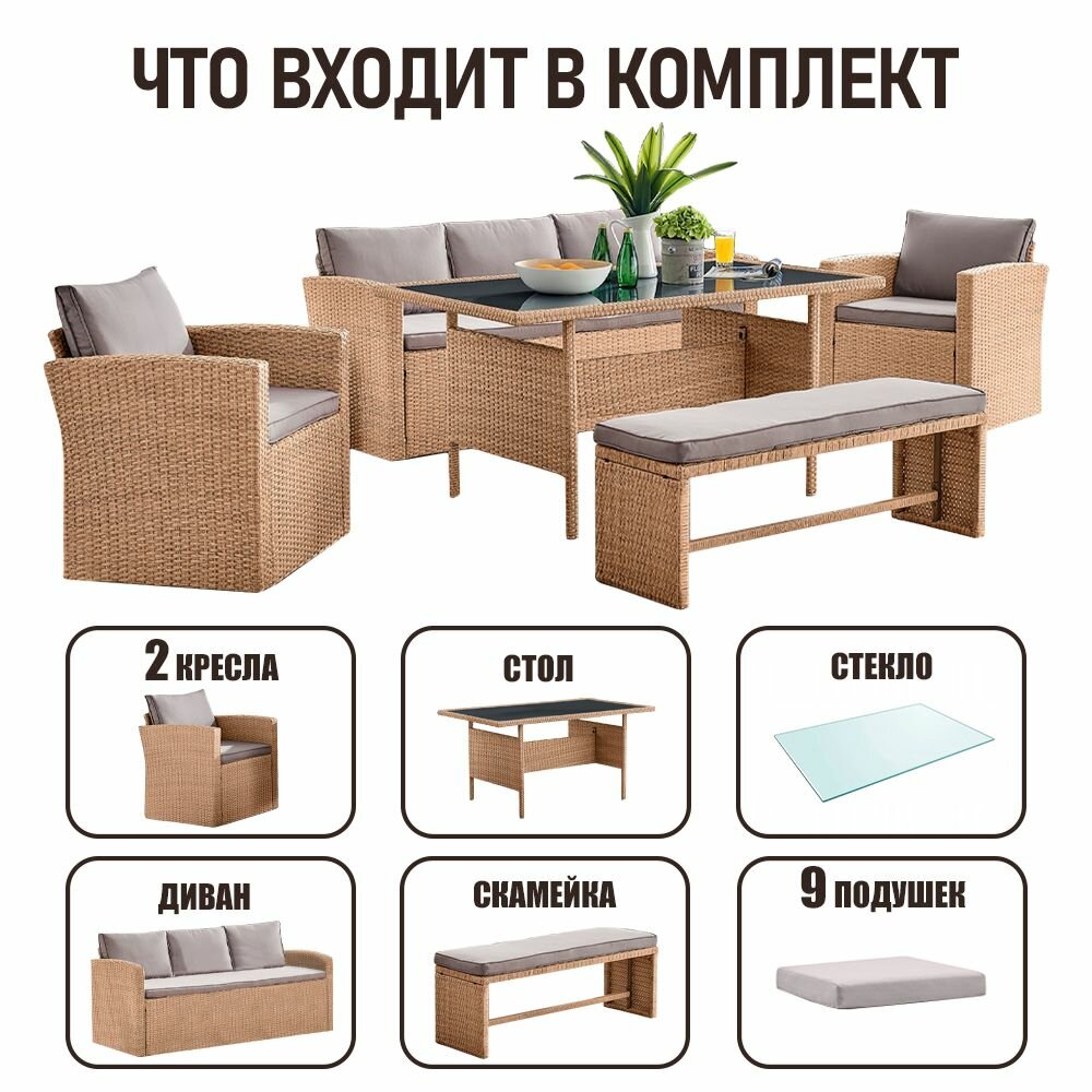| Комплектация | Трёхместный диван с подушками на сиденье и под спину; Два кресла с подушками на сиденье и под спину; Обеденный стол с закалённым стеклом 5мм; Скамейка с подушкой. Набор садовой мебели |