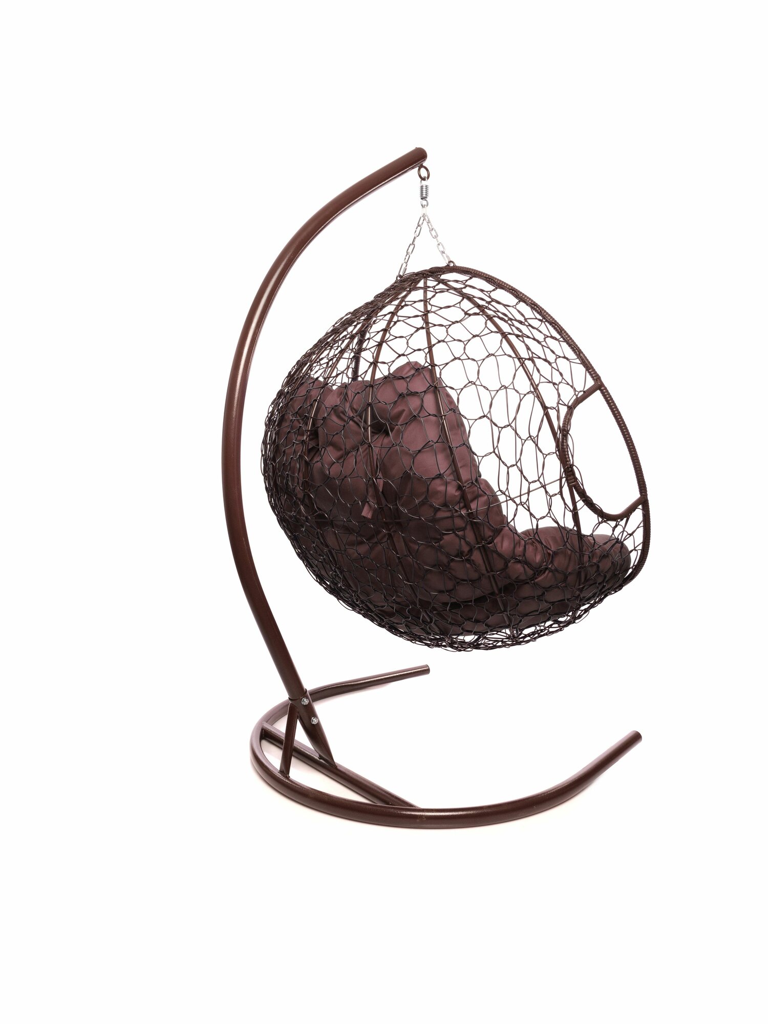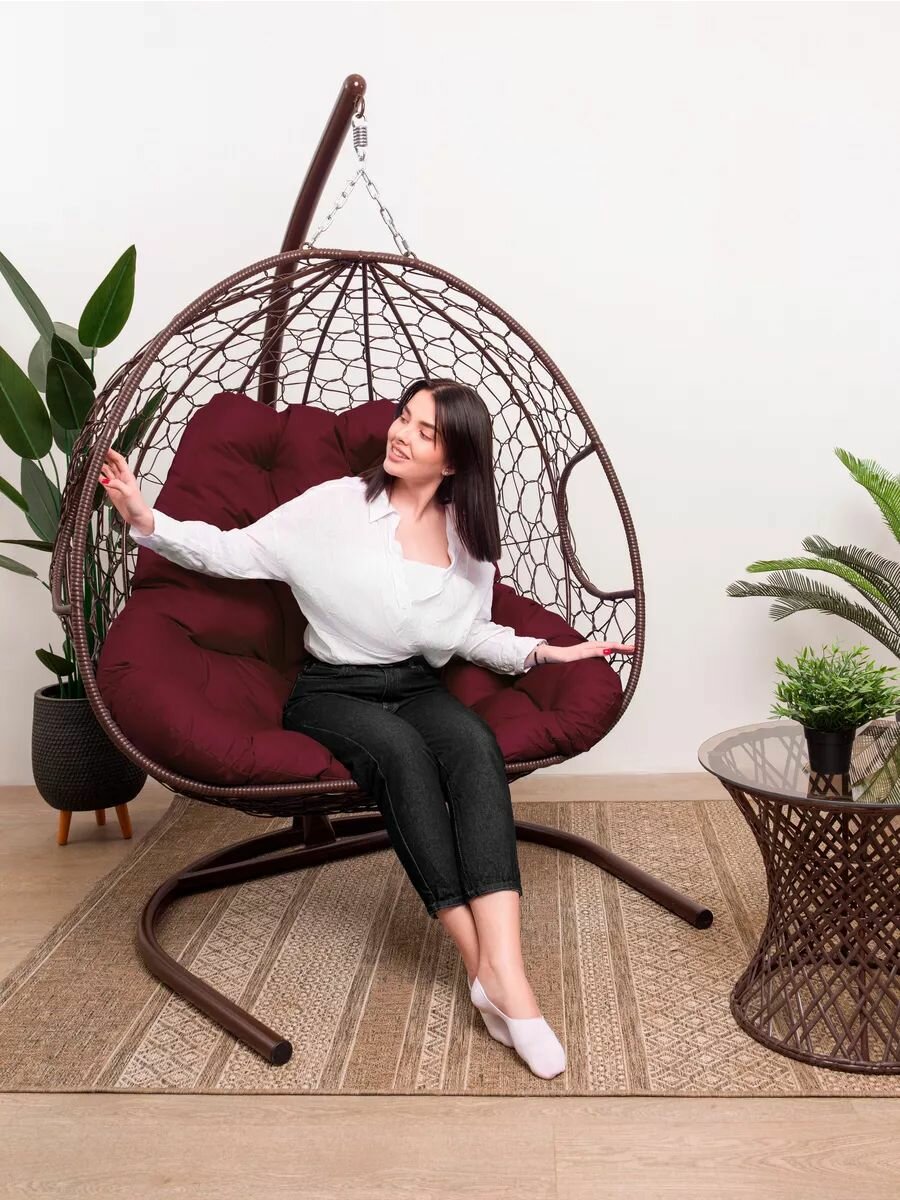 Купить Подвесное кресло для двоих с ротангом коричневое, бордовая подушка