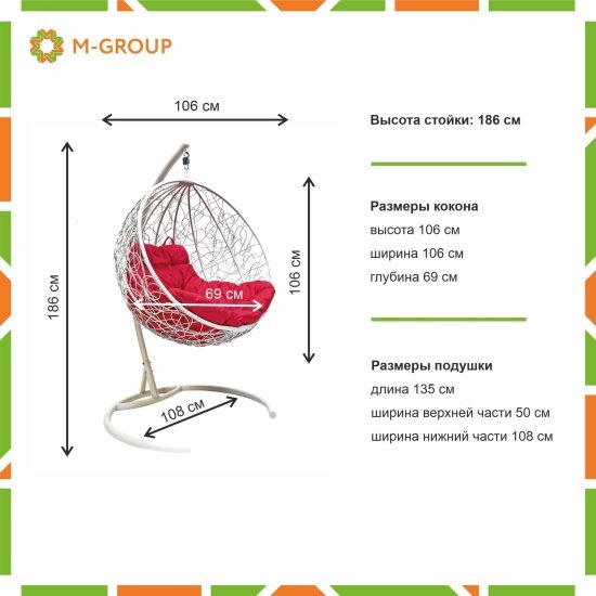 Купить Подвесное кресло кокон M-group круг люкс с ротангом белое+красная подушка