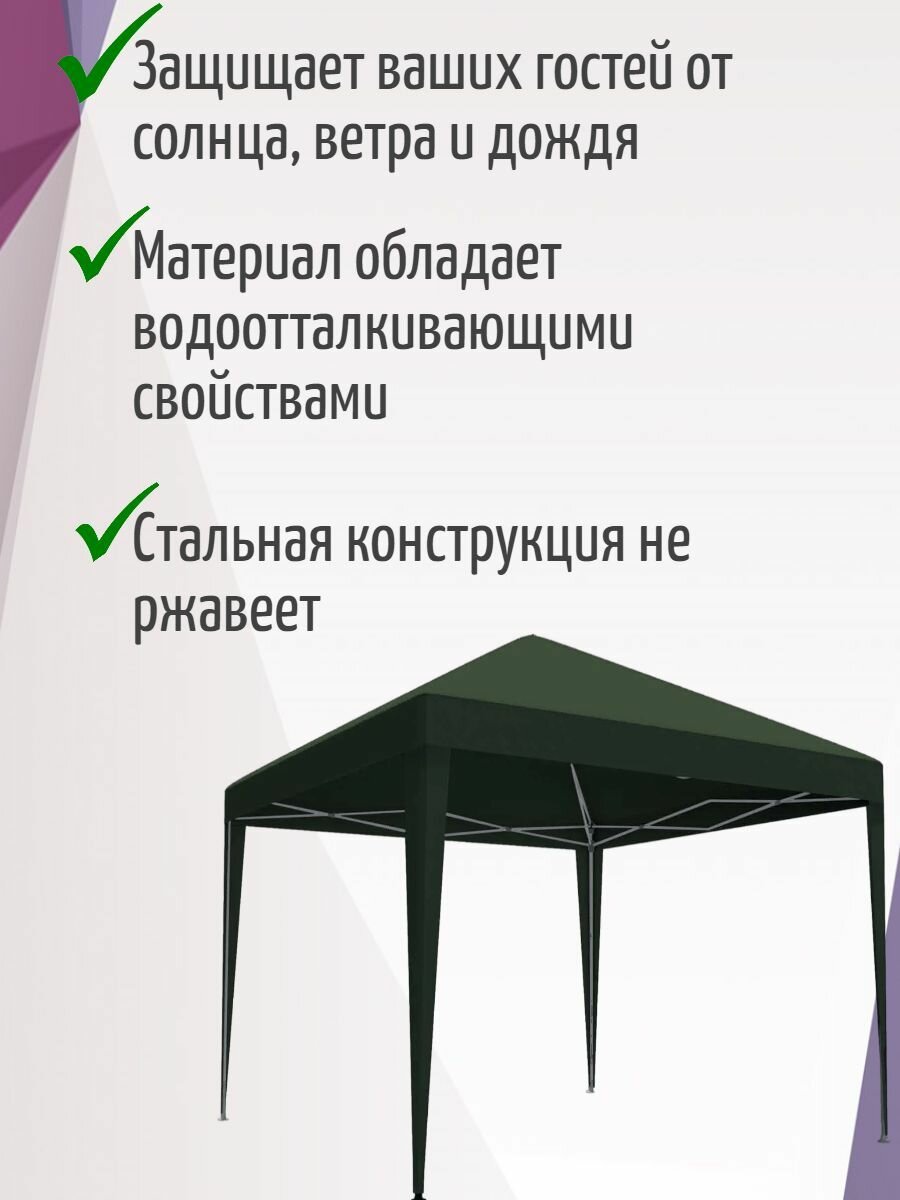 СохранитьТент садовый 295x295x260 см, цвет зеленый - защищает ваших гостей от солнца, ветра и дождя. Благодаря большой площади покрытия вы можете легко установить под ним стол и стулья. интересное:
