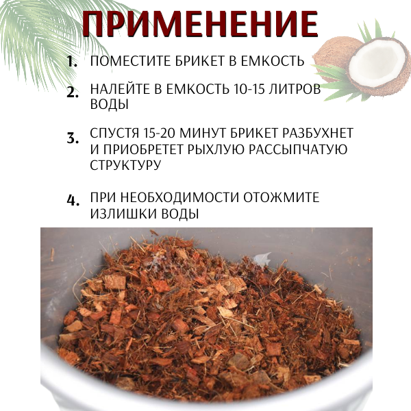| Основные питательные вещества в мг/л, не менее | Изготовлен исключительно из кокосового ореха без добавления химических удобрений |