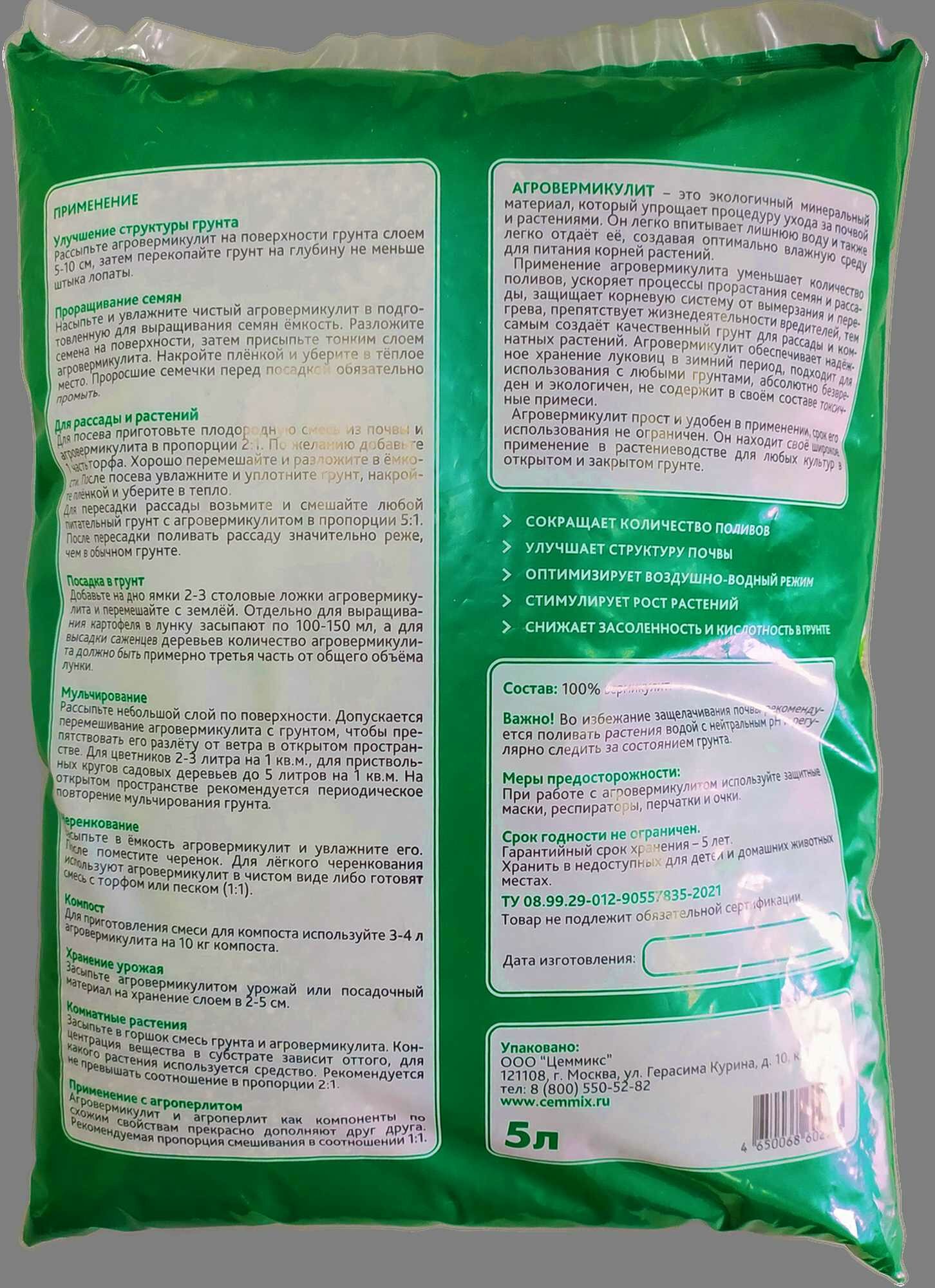 | Дополнительная информация | при работе с агровермикулитом используйте защитные маски, респираторы, перчатки и очки; срок годности не ограничен; гарантийный срок хранения – 5 лет; хранить в недоступных для детей и домашних животных местах |