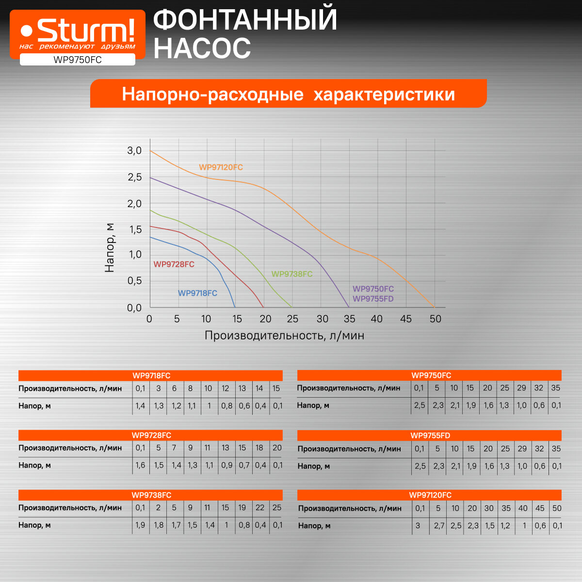 Ниже Вы можете прочитать отзывы на Насос фонтанный Sturm! WP9750FC 50Вт, 35л/м, напор 2.5м, глубина погружения 3м,10м. каб,4 насадки, ознакомится с подробными характеристиками, посмотреть интересные обзоры и фотографии на Насос фонтанный Sturm! WP9750FC 50Вт, 35л/м, напор 2.5м, глубина погружения 3м,10м. каб,4 насадки.