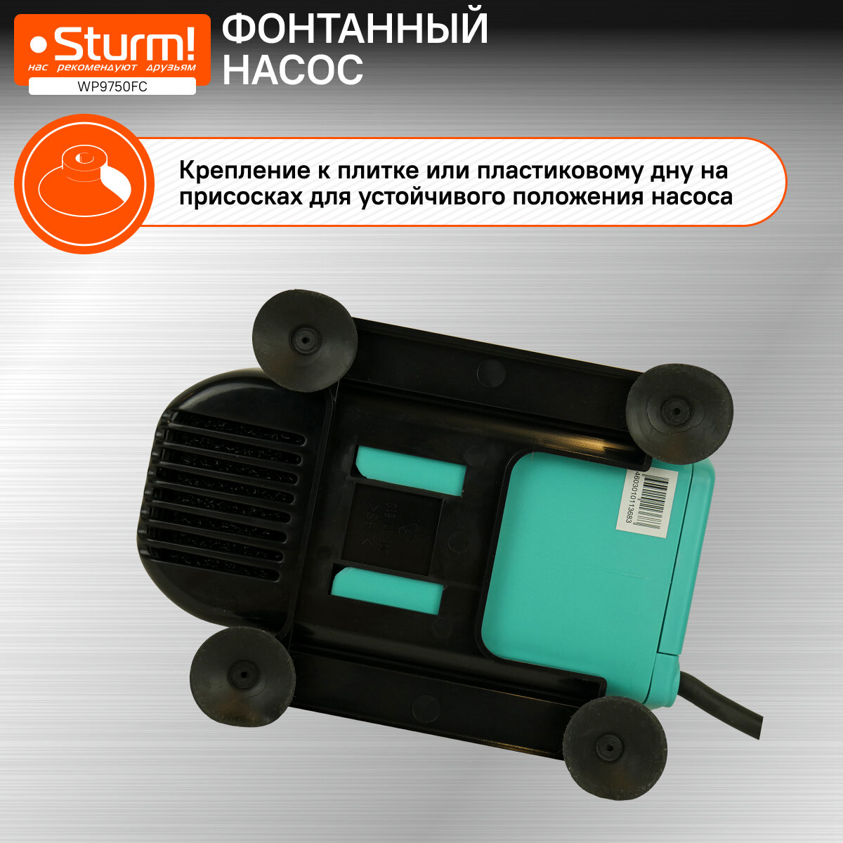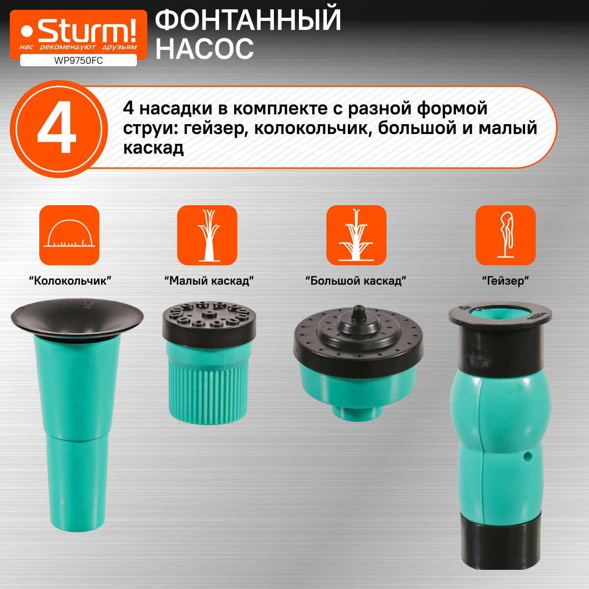 Sturm! WP9755FD Насос фонтанный Sturm! 55Вт, 35л/м, напор 2.5м, глуб погруж 3м,10м. каб.,4 насадки [WP9755FD]