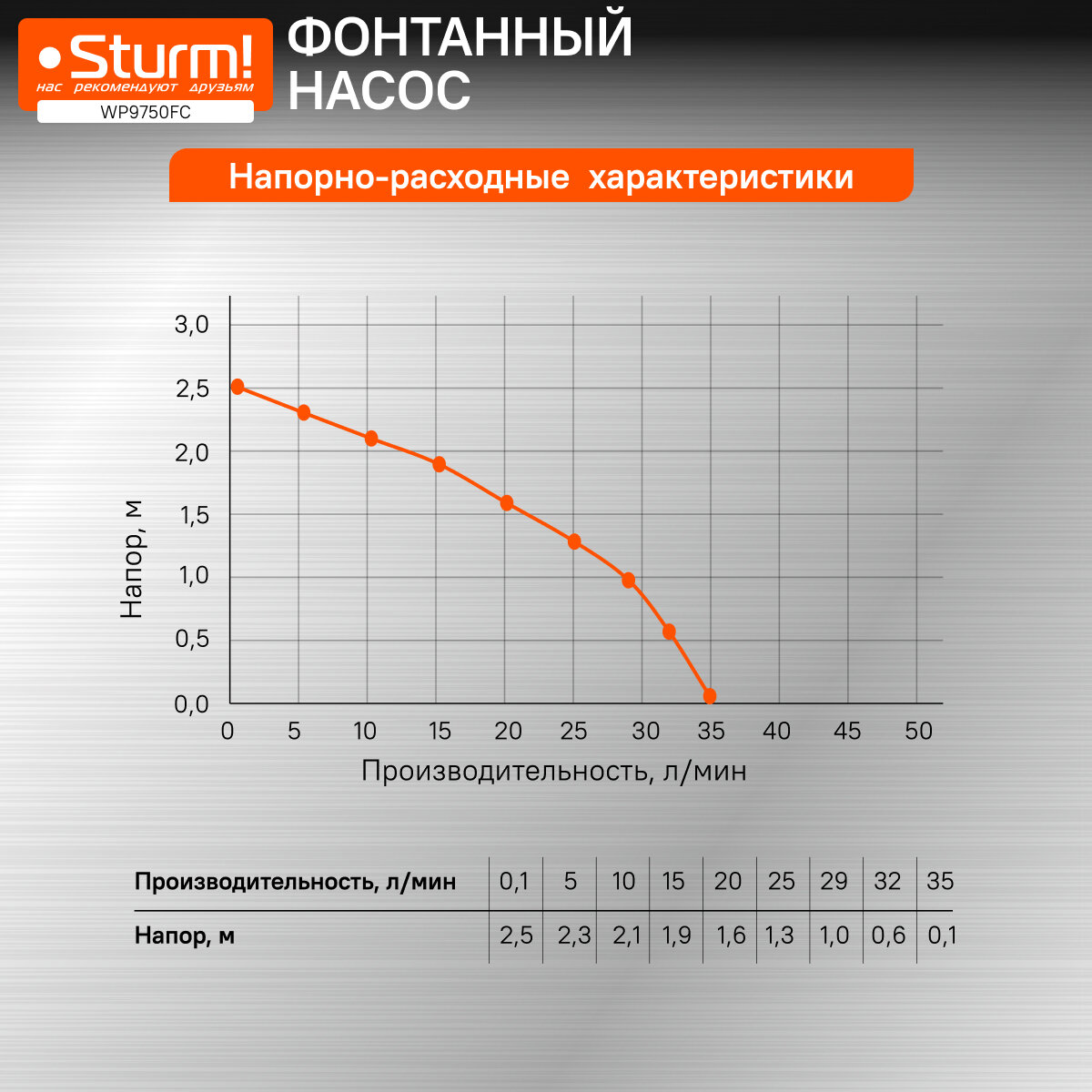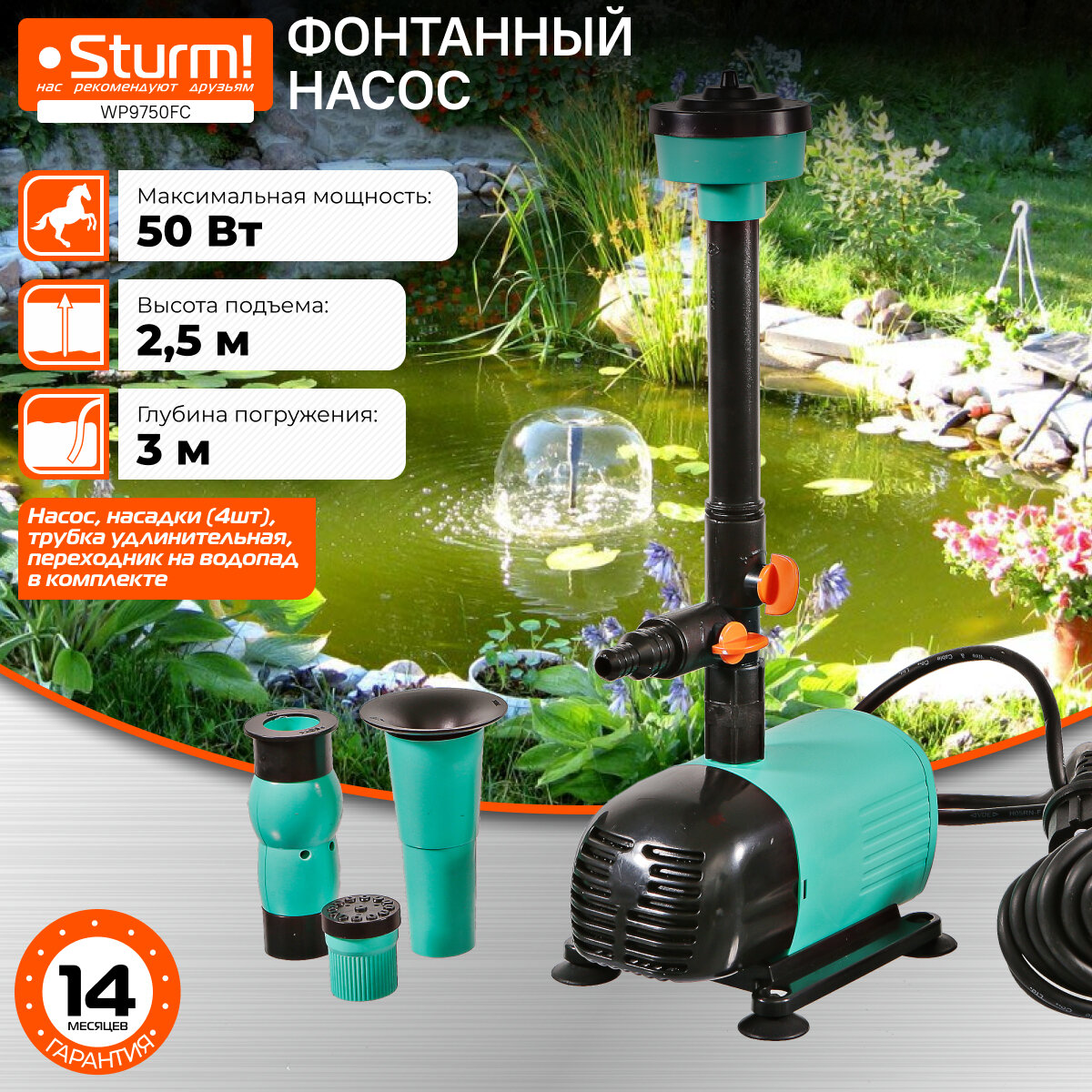 Купить Насос фонтанный Sturm! WP9750FC 50Вт, 35л/м, напор 2.5м, глубина погружения 3м,10м. каб,4 насадки