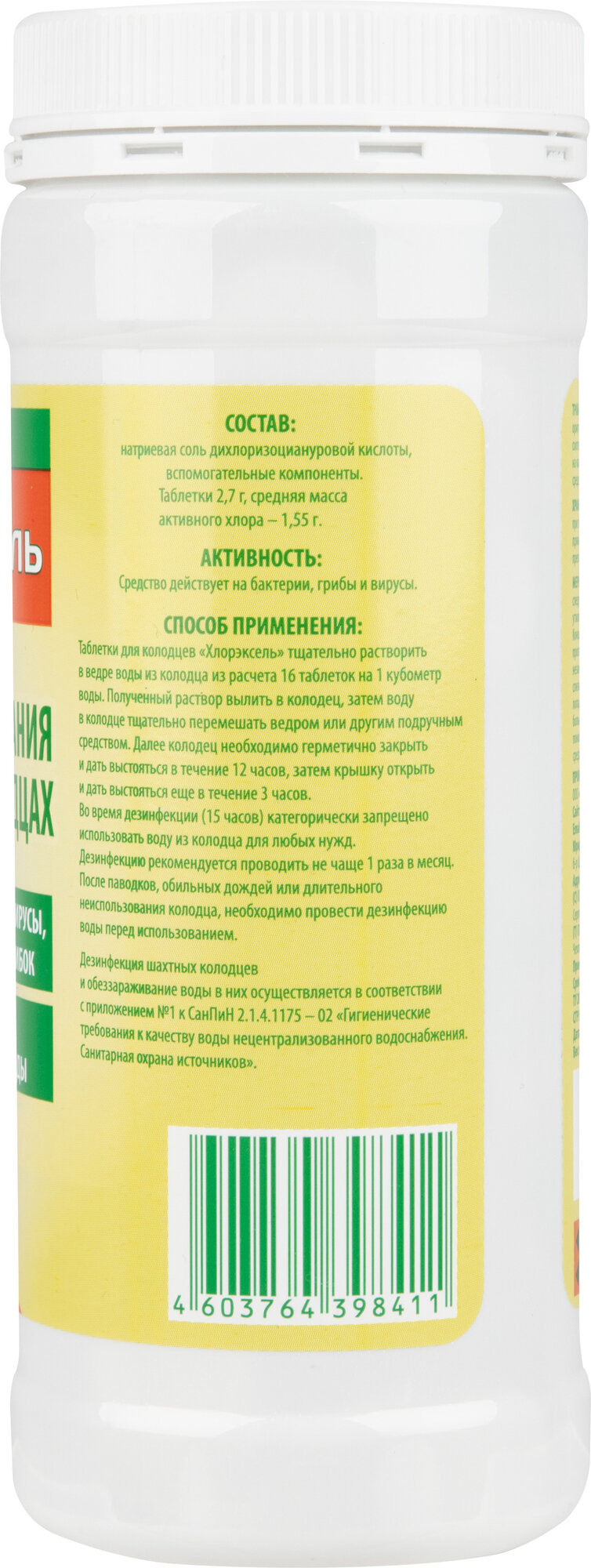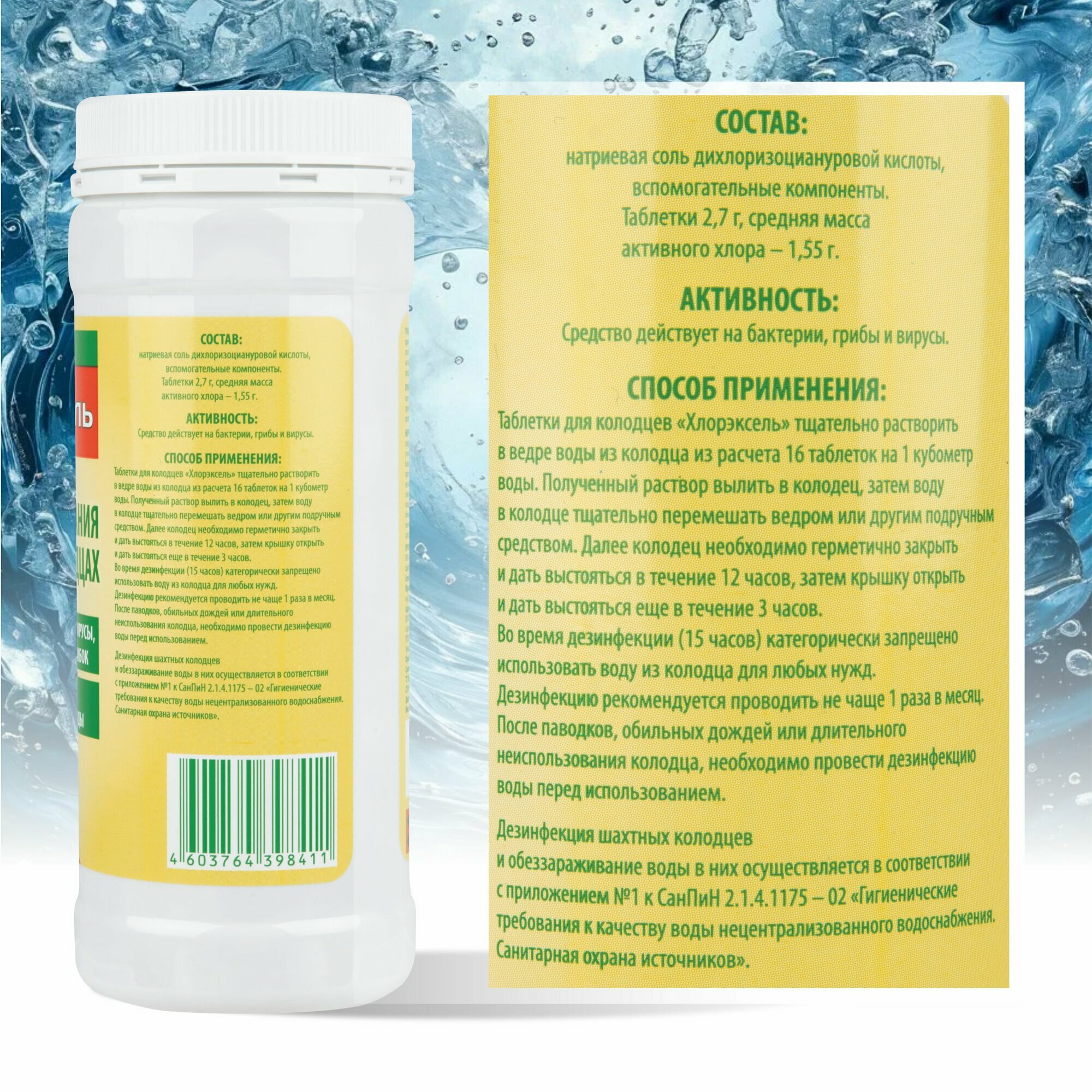 | Дополнительная информация | 0,4 кг (148 таблеток в упаковке), 1 кг (370 таблеток в упаковке). Для получения пригодной к питью воды следует провести комплексную очистку стенок колодца и воды. Время обеззараживания — 15 часов. Внимание! Для эффективной дезинфекции четко следуйте инструкции по применению |