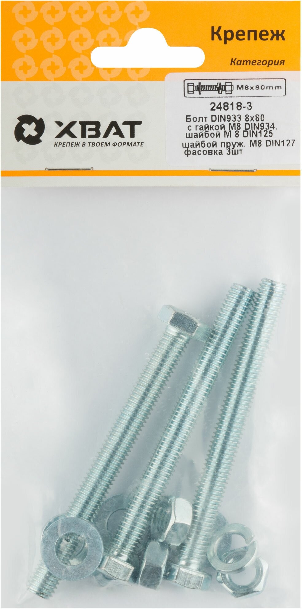 Комплект: Болт DIN933 8х80, с гайкой М8 DIN934, шайбой М 8 DIN125, шайбой пруж. М8 DIN127 (фасовка 3шт.) 24818-3