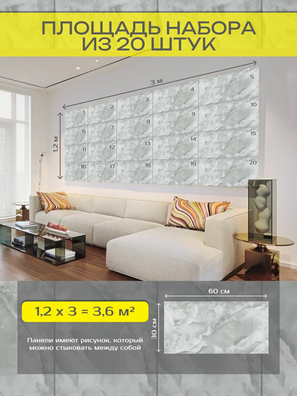 | Дополнительная информация | самоклеящиеся панели 60х30 см - комплект 20 шт. |