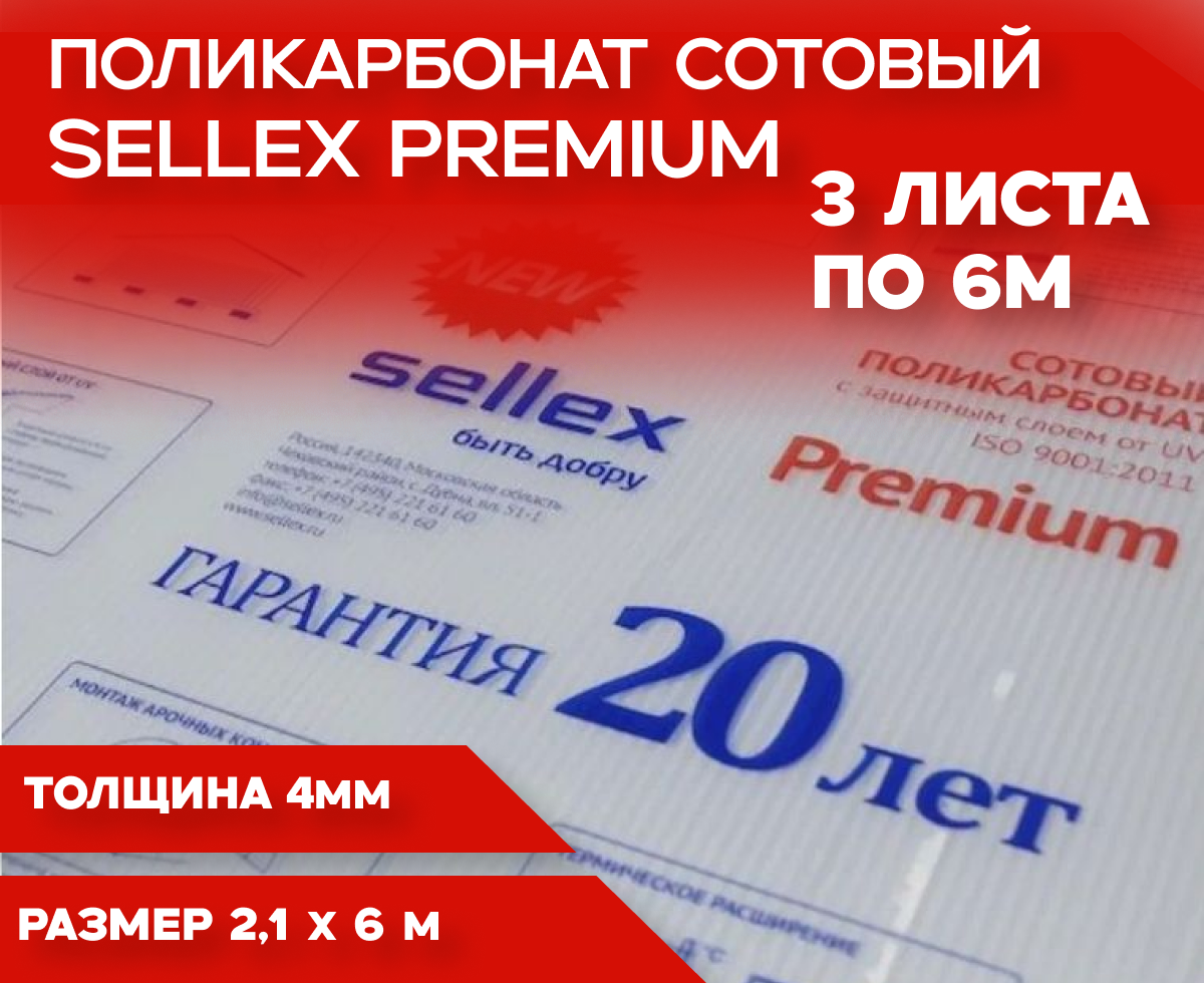 4 мм сотовый поликарбонат Sellex Premium 3 листа по 6 метров