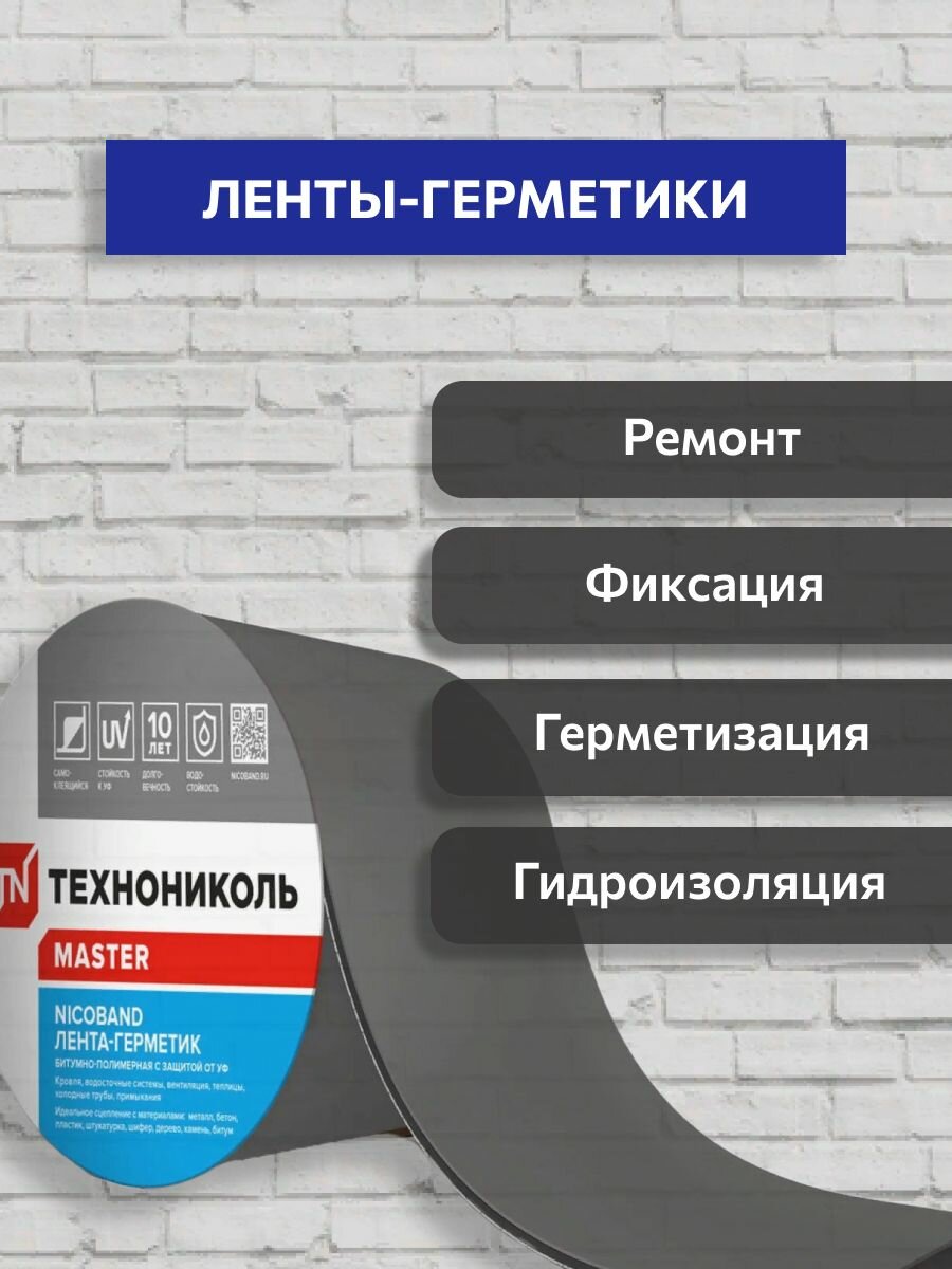СохранитьЛента-герметик NICOBAND Технониколь гидроизоляции кровли, ремонта крыши и окон 10 м х 7,5 см темно серый интересное: