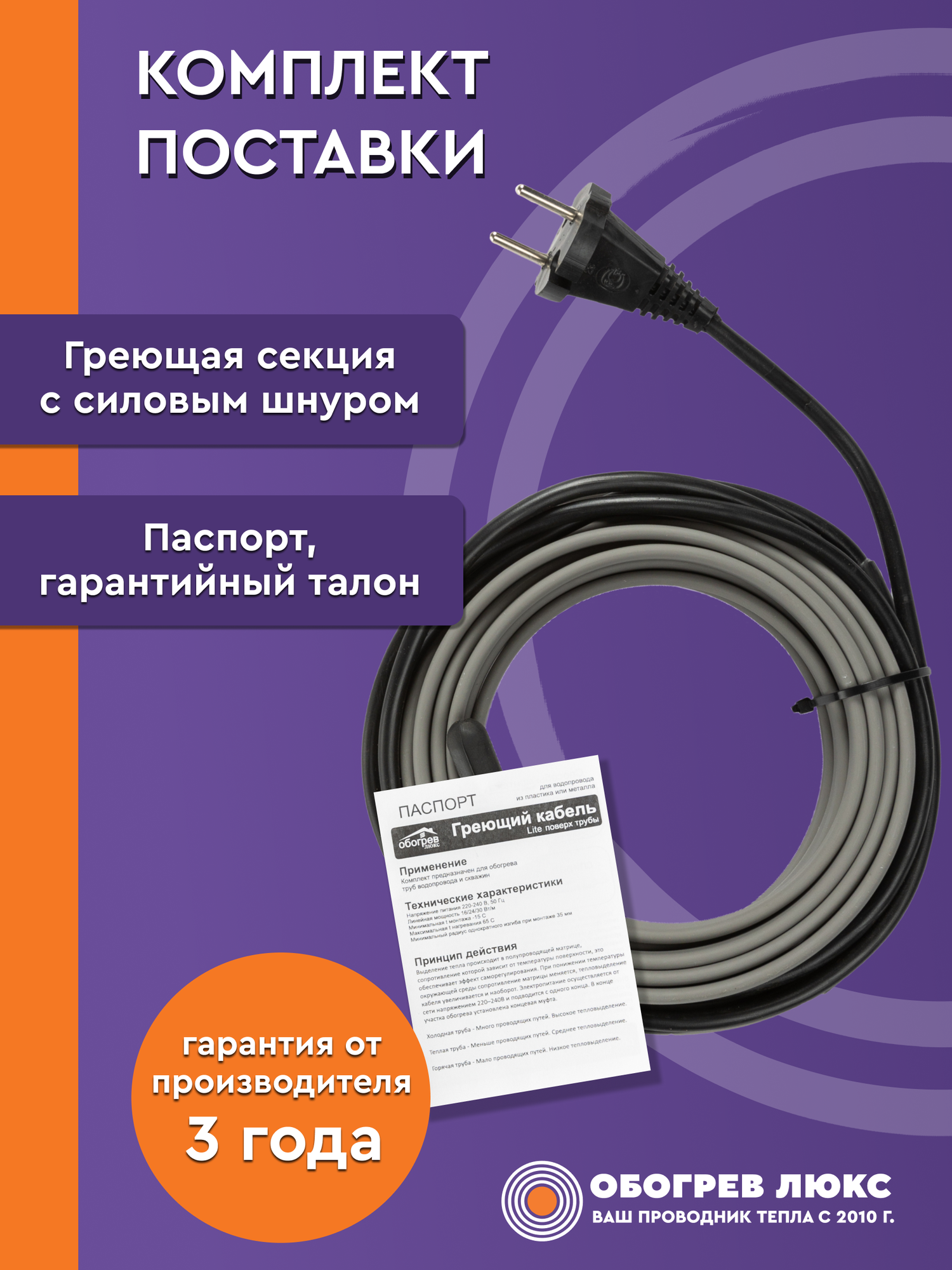 Греющий кабель на трубу 10 м 16 Вт/м саморегулирующийся для водопровода готовый комплект ТМ Обогрев Люкс