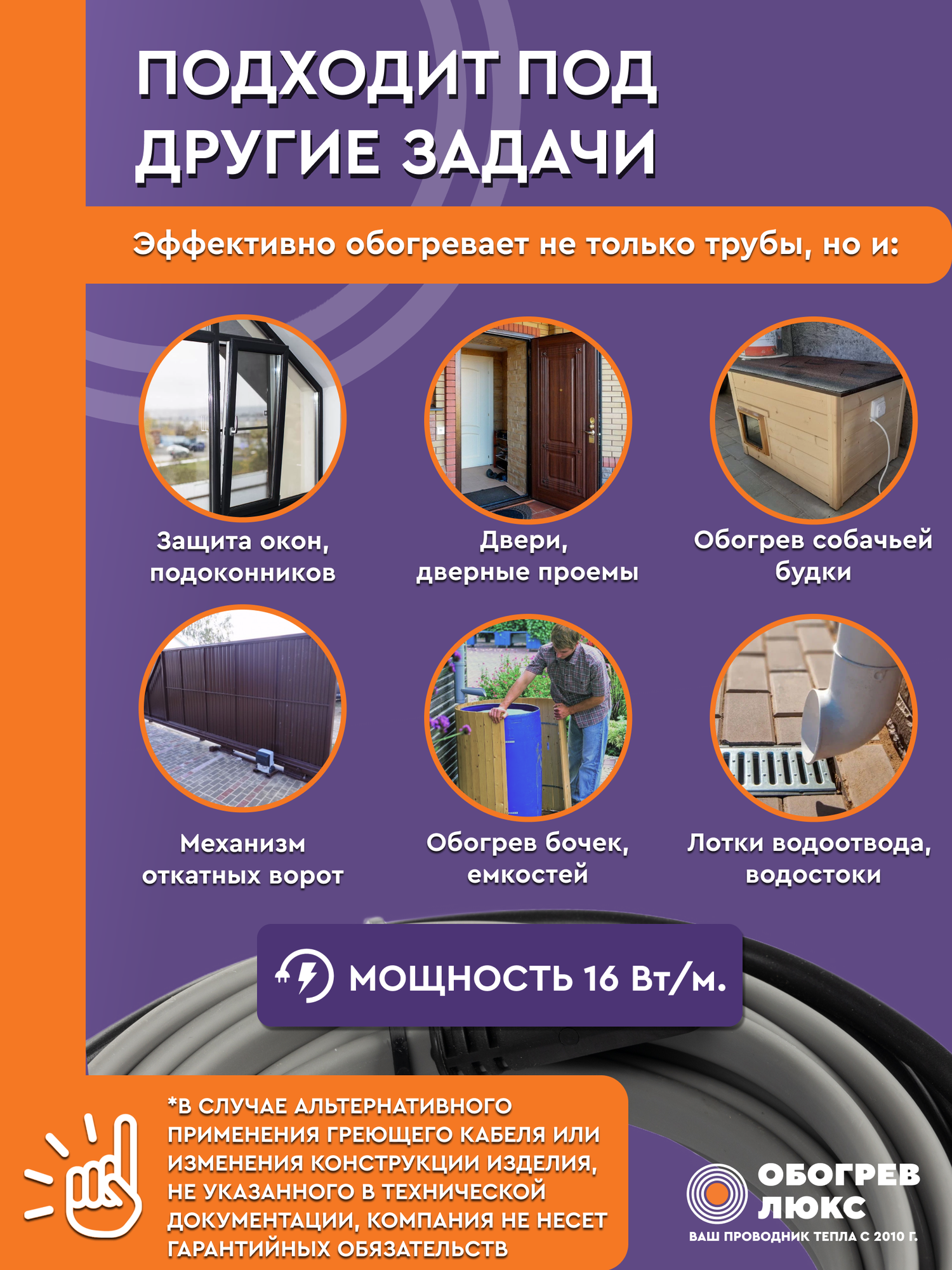 Греющий кабель на трубу 16 м 16 Вт/м саморегулирующийся для водопровода готовый комплект ТМ Обогрев Люкс
