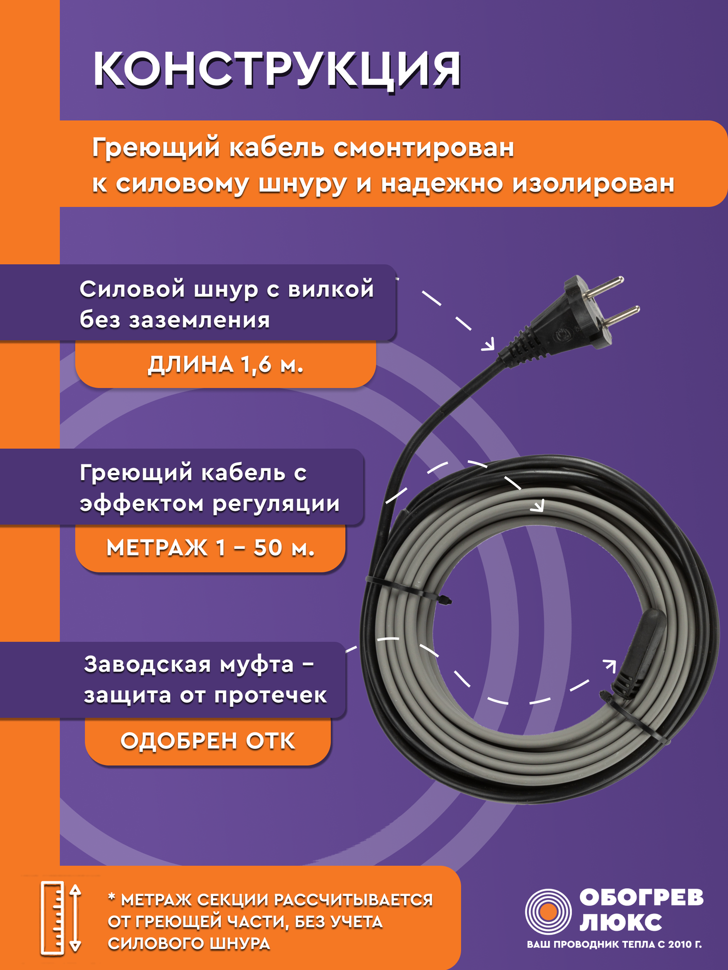 Греющий кабель саморегулирующийся Обогрев Люкс Standart для канализации 1 м