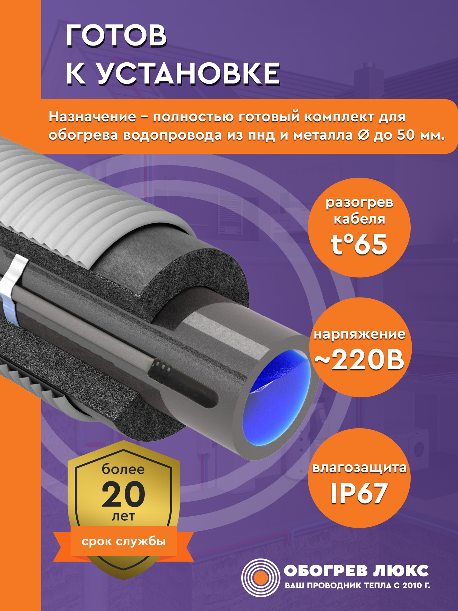 Греющий кабель на трубу 20 м 16 Вт/м саморегулирующийся для водопровода готовый комплект ТМ Обогрев Люкс