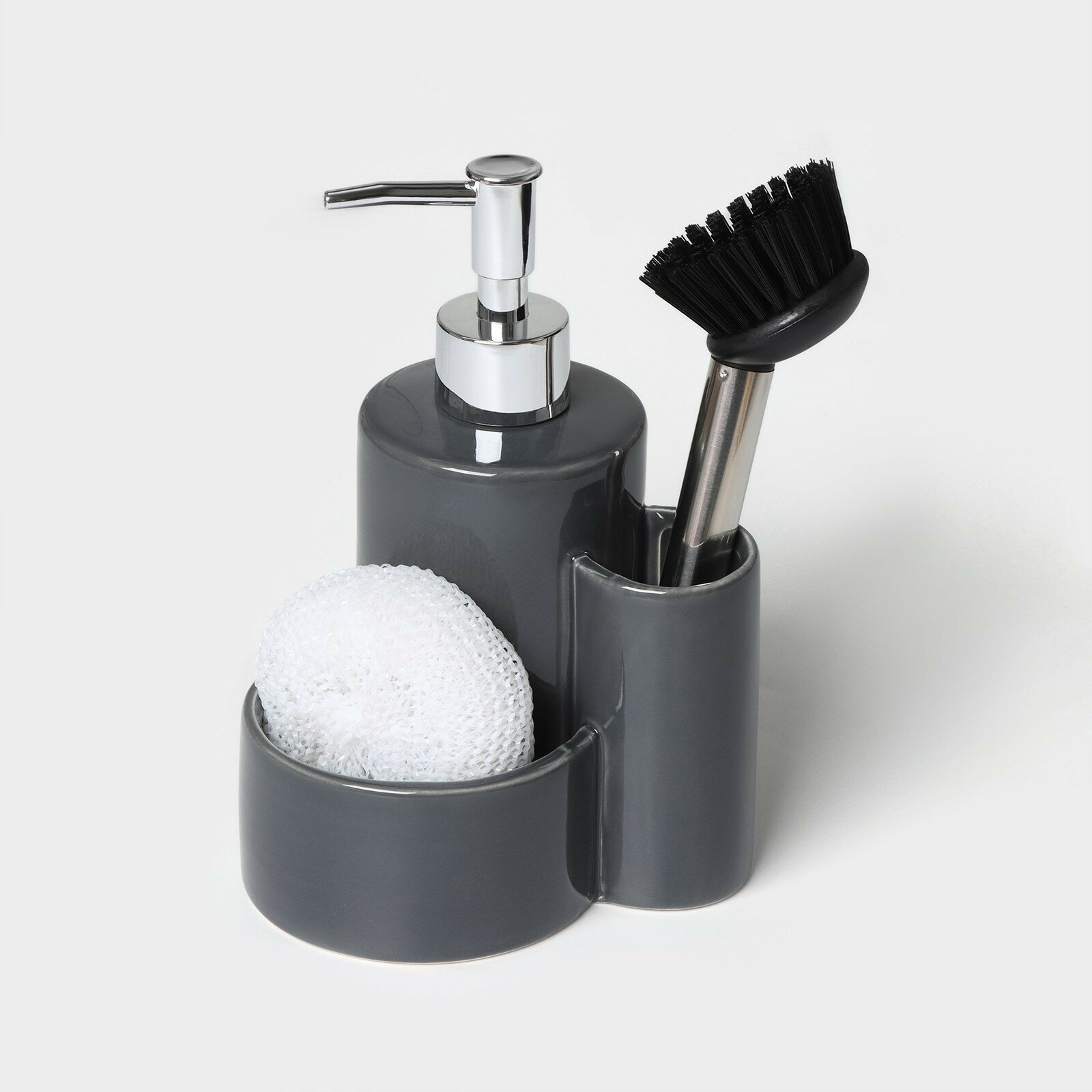 Купить Дозатор для моющего средства Доляна "Милитари", 370 мл, с губкой и щеткой, цвет серый