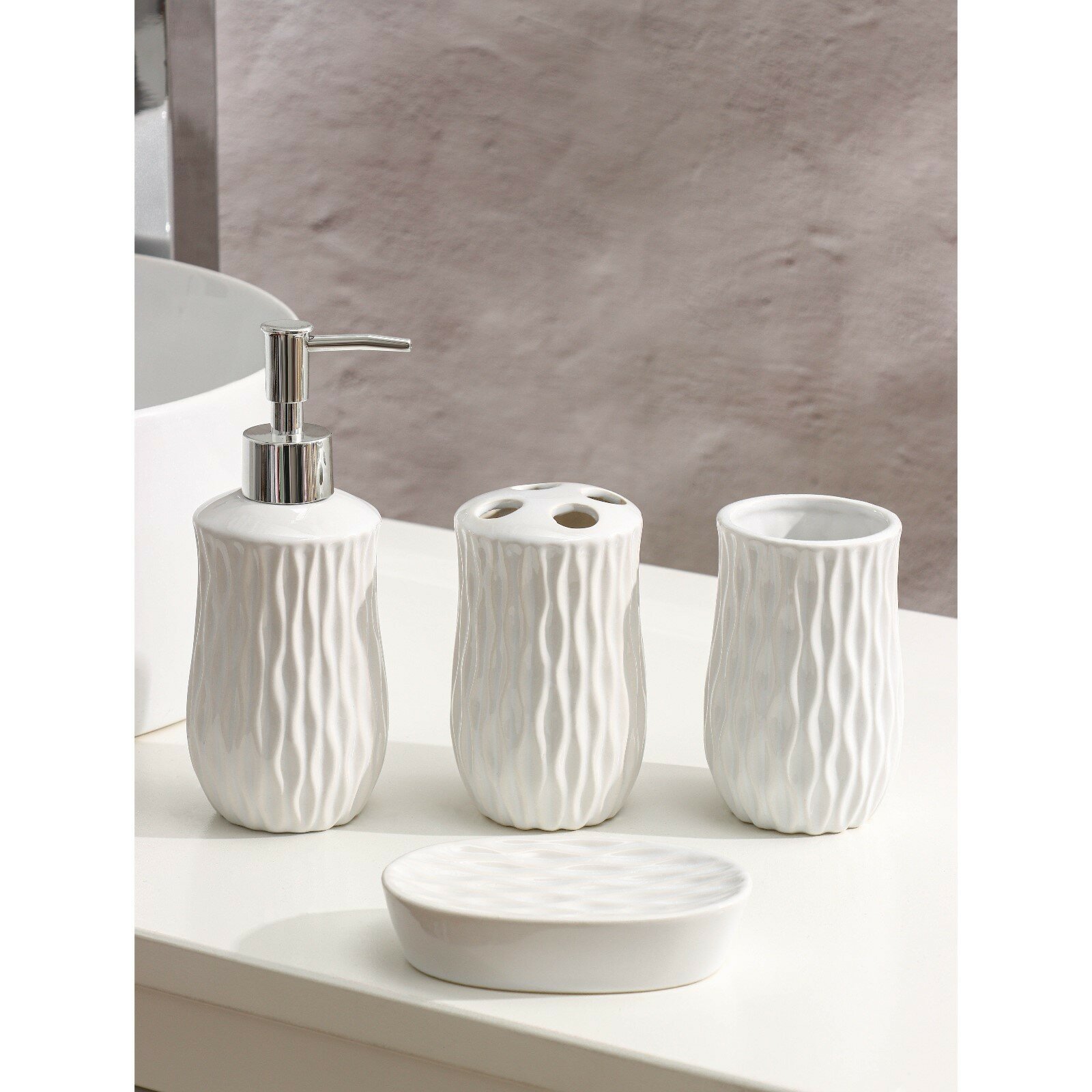 Купить Дозатор для жидкого мыла и стакан для зубных щеток с мыльницей, набор 4 предмета Доляна «Течение» цвет белый