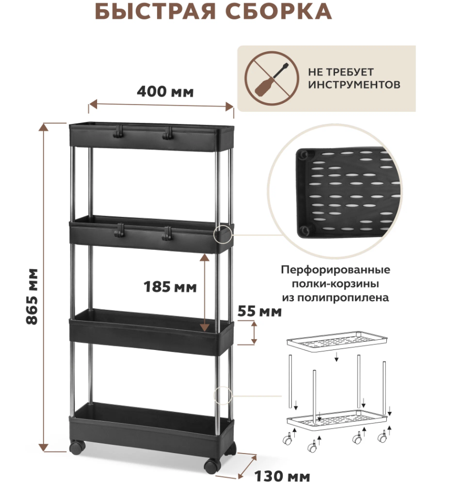 | Комплектация | Колеса - 4 шт; крючок пластиковый - 4 шт; стойка из нержавеющей стали - 12 шт; полка пластиковая - 4 шт; заглушка для стойки - 6 шт |