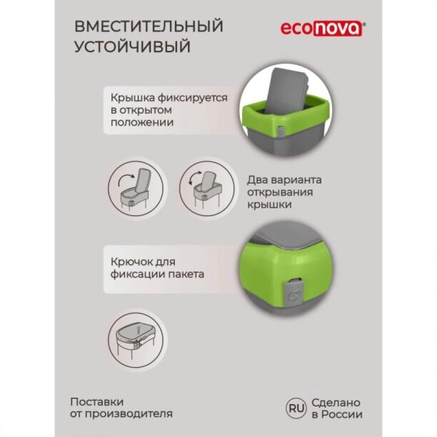 | Дополнительная информация | Удобная система открывания крышки позволит выбросить мусор в ведро даже с занятыми руками, просто толкнув створку вниз. Крышка может фиксироваться в открытом положении для крупного мусора. Крышка может фиксироваться в открытом положении для крупного мусора. Есть специальное крепление для мусорных пакетов. |
