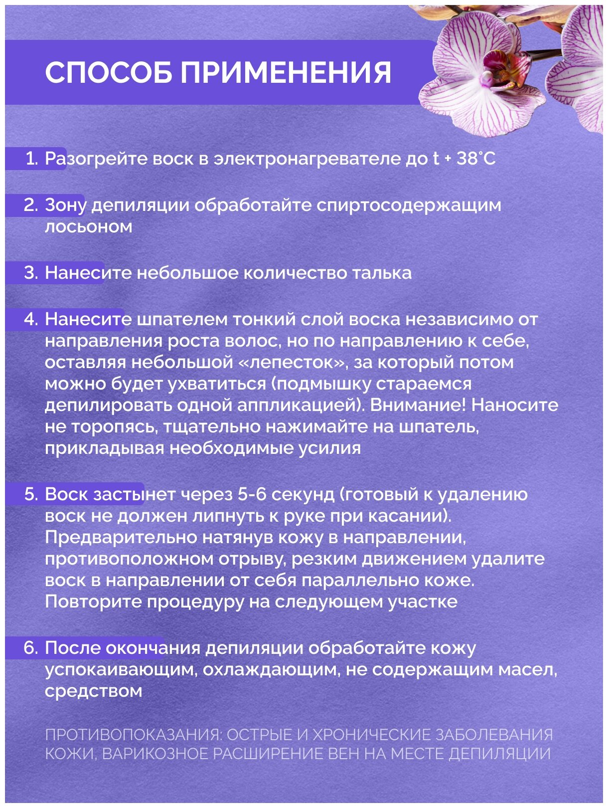 | Способ применения | разогреть воск до температуры 38°С на водяной бане или в воскоплаве. Обезжирить кожу и присыпать тальком. Распределить продукт тонким слоем с помощью шпателя по направлению роста волосков (при работе с интимной зоны - наносить по направлению к себе, удалять - от себя). Когда воск остынет и образуется плёнка (5-6 секунд), не используя полосок, придерживая и натягивая кожу одной рукой, другой удалить плёнку резким движением против роста волос. Повторить процедуру необходимое количество раз. После депиляции удалить остатки средства косметической водой. Нанести средство после депиляции |