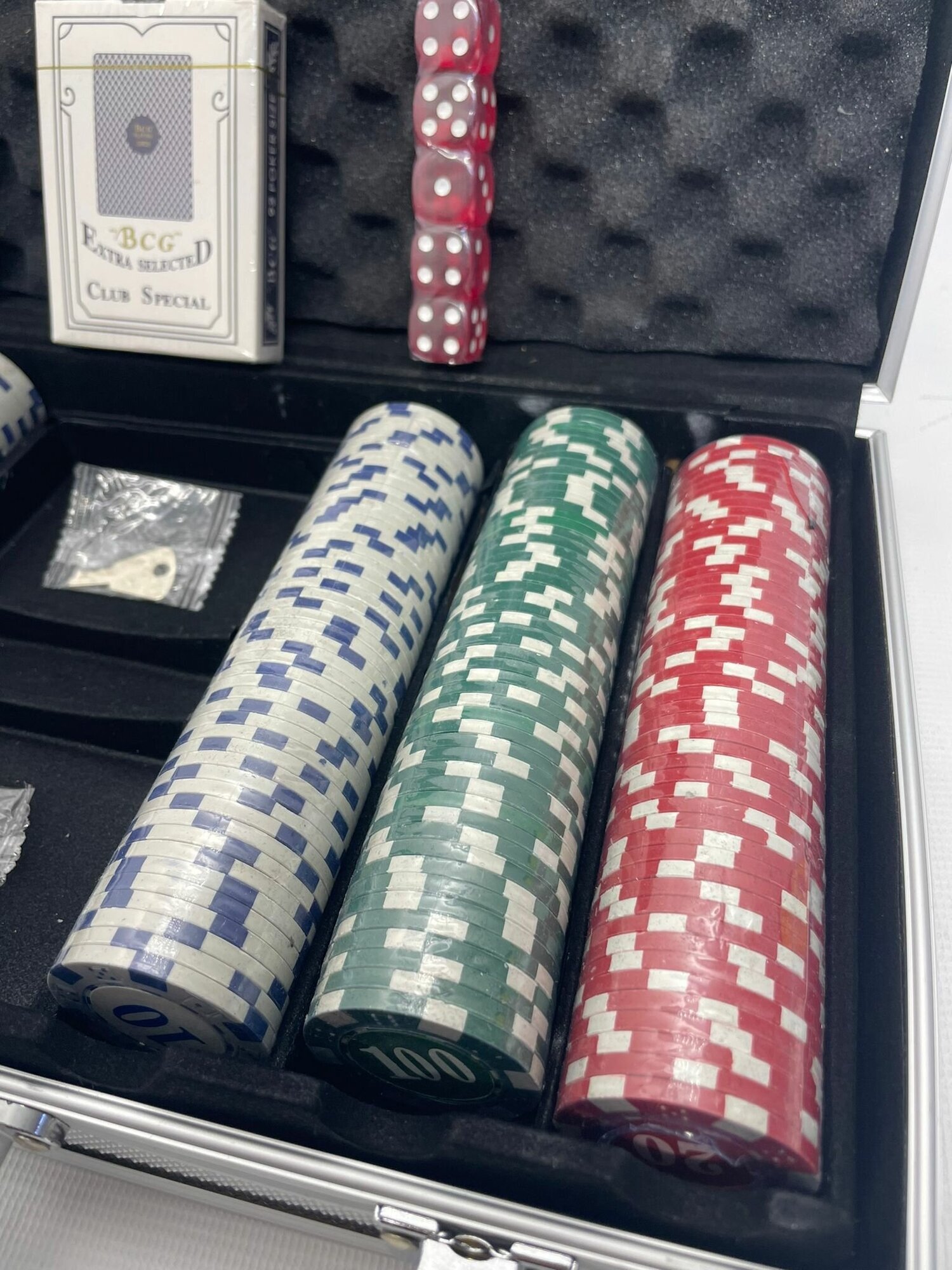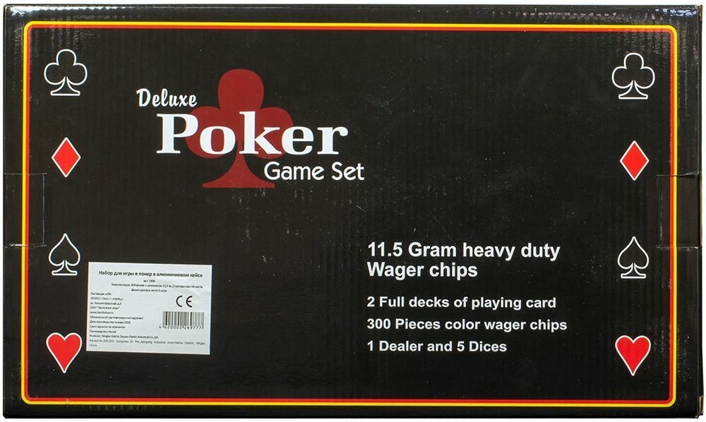 | В наборе | Карты материал: с пластиковым покрытием Количество фишек: 300 Номинал фишек: 10-100шт, 20-50шт, 50-50шт, 100-50шт, 500-50шт Карты: 2 колоды Кости: 5 костей Дополнительно: фишка дилера Кейс: металлический кейс + ключи |